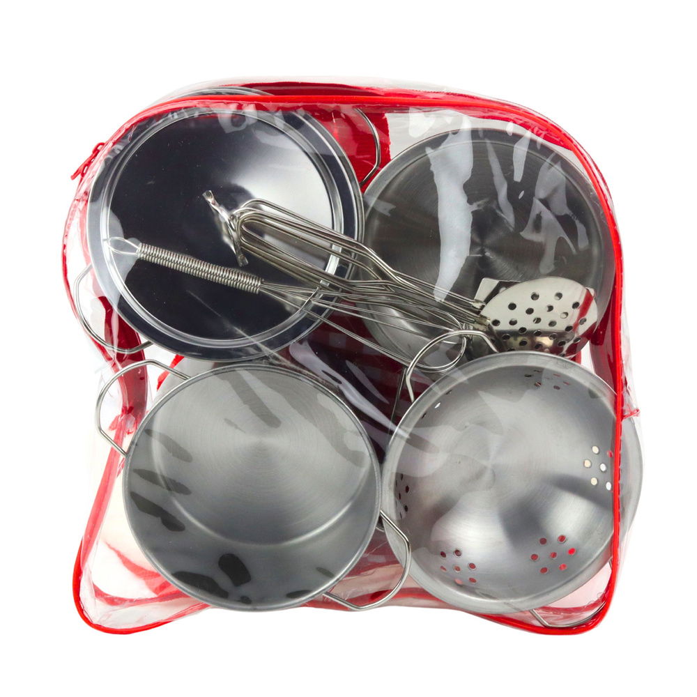 Wymiary plecaka wynoszą około 20 x 21 x 6 cm, a pełna zawartość zestawu obejmuje m.in.: garnek z pokrywką, garnek głęboki, patelnię, cedzak, trzepaczkę, łyżkę wazową, łyżkę dziurkowaną, szumówkę, rękawicę i ściereczkę kuchenną. Przezroczysty plecak z zamkiem zapewnia łatwe przechowywanie i transport.