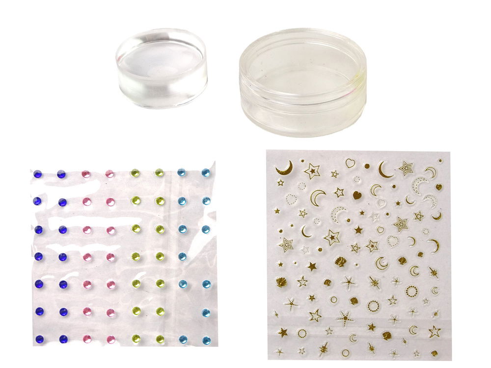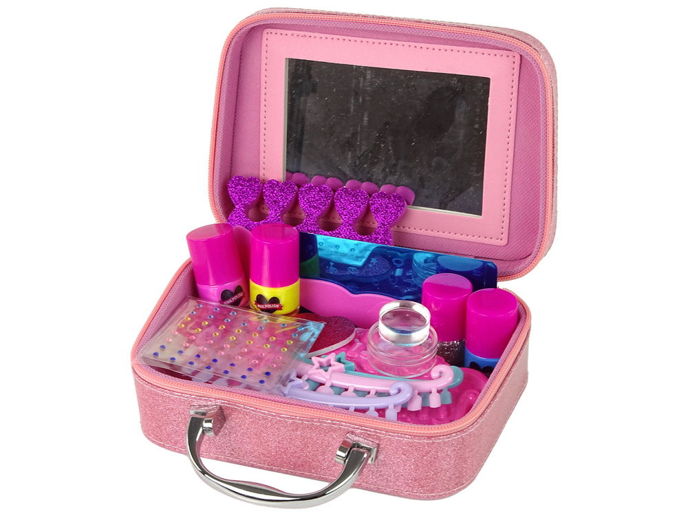 Wnętrze kryje bogaty zestaw akcesoriów, takich jak 4 lakiery w różnych kolorach, separator kosmetyczny, pilnik, blaszka z wzorkami, szpatułka, 3 szablony tipsów, naklejki, kryształki, stempel, pojemnik oraz naklejki na tipsy. Dodatkowo, lusterko umieszczone w środku pozwala dzieciom podziwiać efekty swojej twórczości.