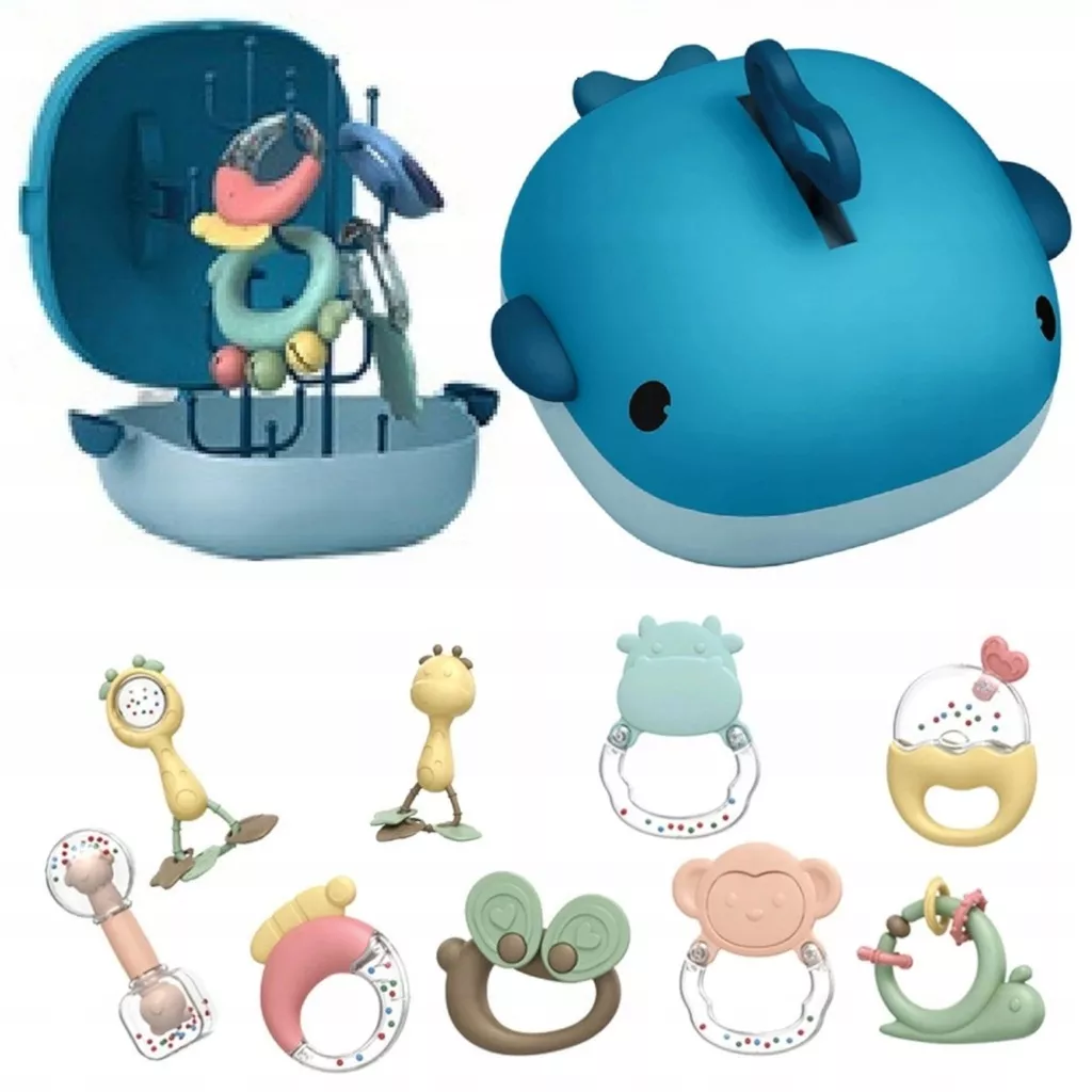 Odkryj magiczny świat zabawy i nauki dla najmłodszych dzięki zestawowi grzechotek i gryzaków w uroczym kształcie wieloryba. Ten kompletny zestaw zawiera 10 różnorodnych akcesoriów, takich jak żyrafa, motyl czy pszczółka, które zapewniają stymulację zmysłów i rozwijają koordynację wzrokowo-ruchową maluszka. Dodatkowo, miękkie silikonowe elementy łagodzą ból dziąseł podczas ząbkowania. Zestaw jest zapakowany w praktyczną walizkę, co ułatwia przechowywanie. To bezpieczny i certyfikowany produkt, który dostarczy wiele radości zarówno dziecku, jak i rodzicom. Dzięki temu zestawowi, rozwój i nauka będą przyjemnością dla malucha, a także doskonałą okazją do wspólnej zabawy i nauki.