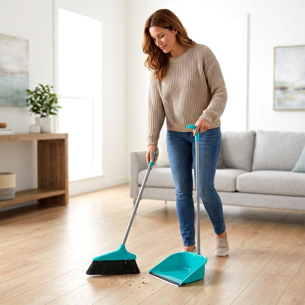 Zestaw szufelka ze zmiotką do zamiatania z długą rączką, pozwala na komfortowe sprzątanie w pozycji stojącej, eliminując potrzebę schylania się. To rozwiązanie znacznie zmniejsza obciążenie kręgosłupa i redukuje ryzyko bólu czy dyskomfortu podczas codziennych prac porządkowych. Z jego pomocą w łatwy sposób uprzątniemy okruszki, kurz i sierść.