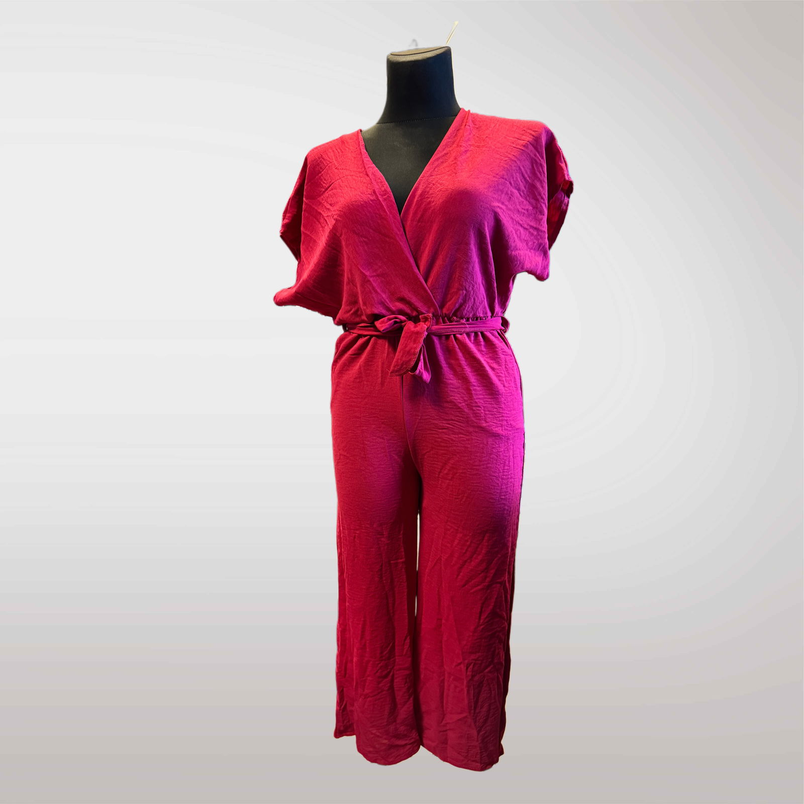 Stylowy kombinezon o eleganckim kroju. Kopertowy dekolt pięknie podkreśla sylwetkę, a gumka w talii zapewnia wygodne dopasowanie. Luźne, szerokie nogawki nadają lekkości i komfortu, sprawiając, że jest idealny na cieplejsze dni.