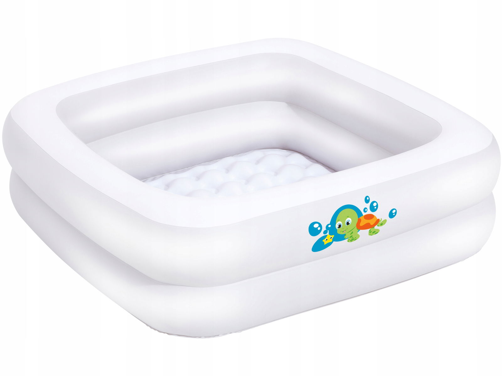 Świetnie sprawdzi się jako alternatywa dla tradycyjnej, plastikowej wanienki. Żywa kolorystyka w odcieniu szarości z wesołym obrazkiem żółwia przyciąga uwagę dziecka i zachęca do spędzania czasu na powietrzu.