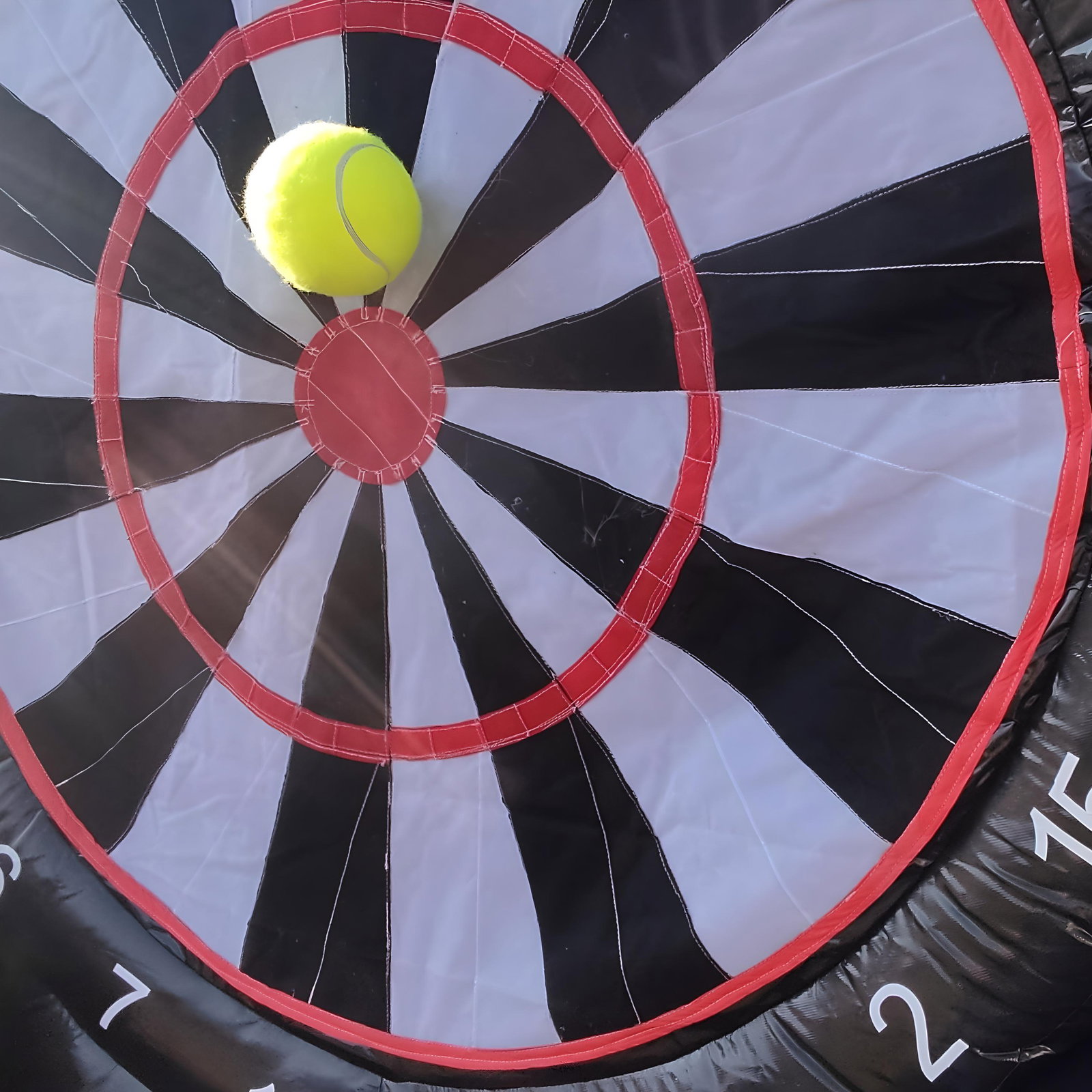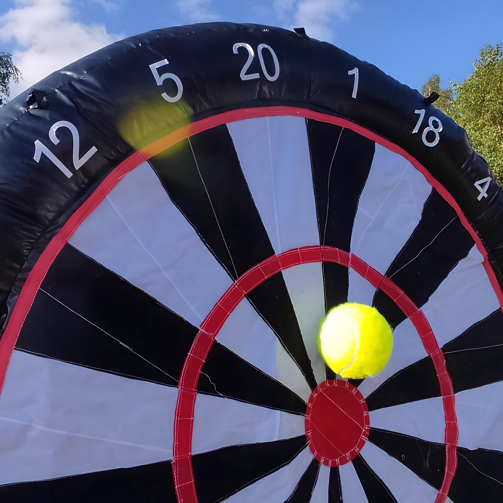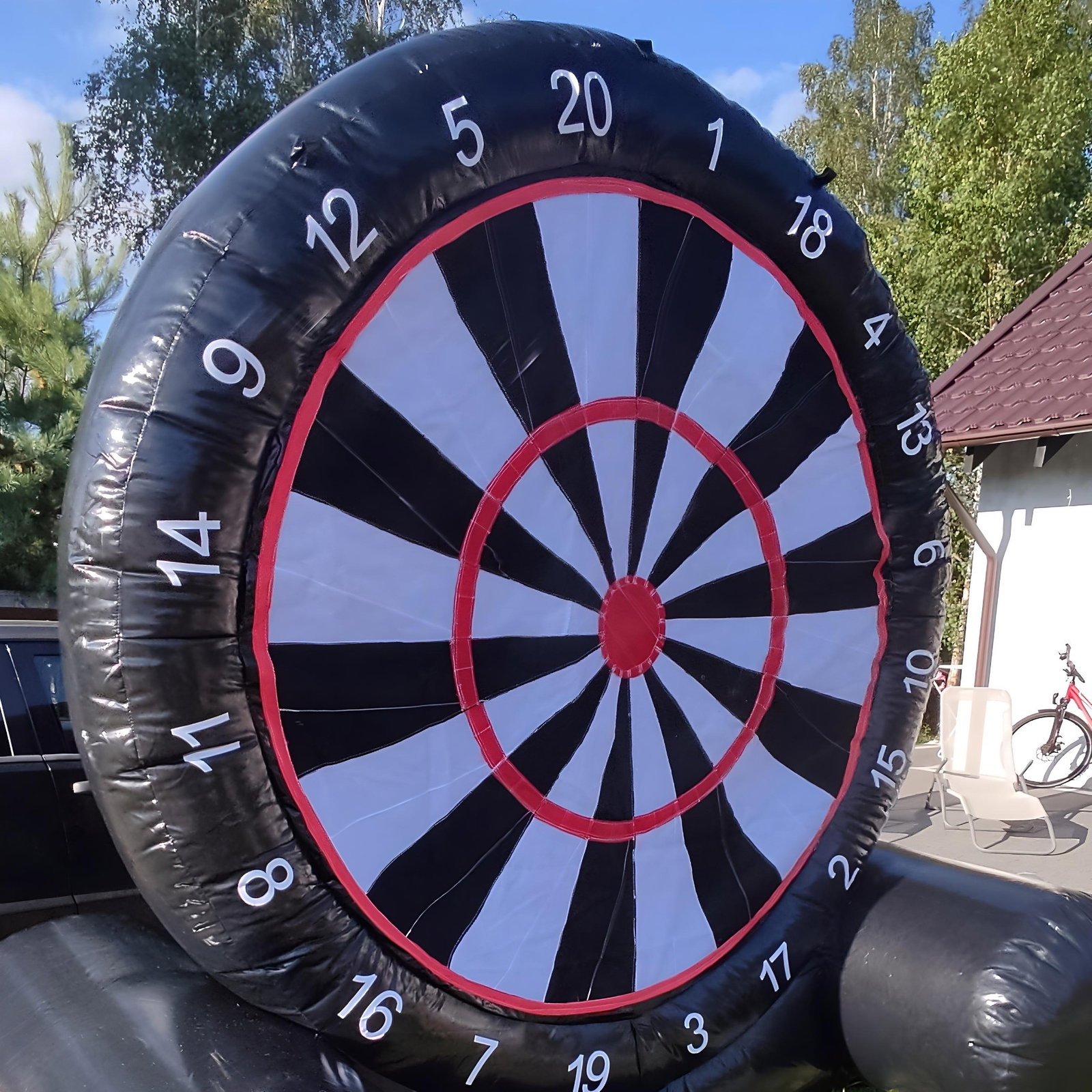 ⚡️Jest to ogromna dmuchana tarcza z wielkimi punktami, na które można rzucać duże dmuchane „darty”, podobne do rzucanych w popularnej grze w darta.
