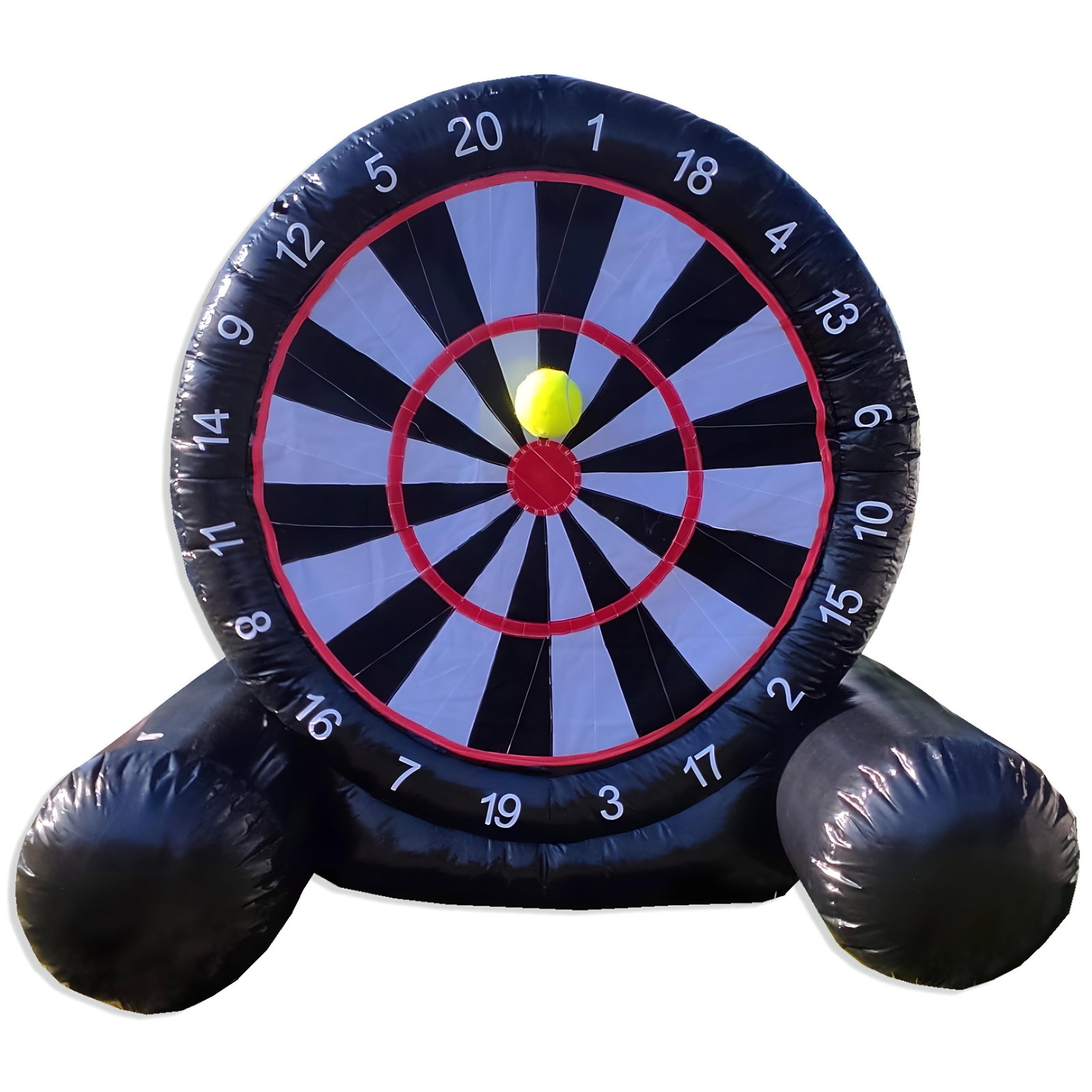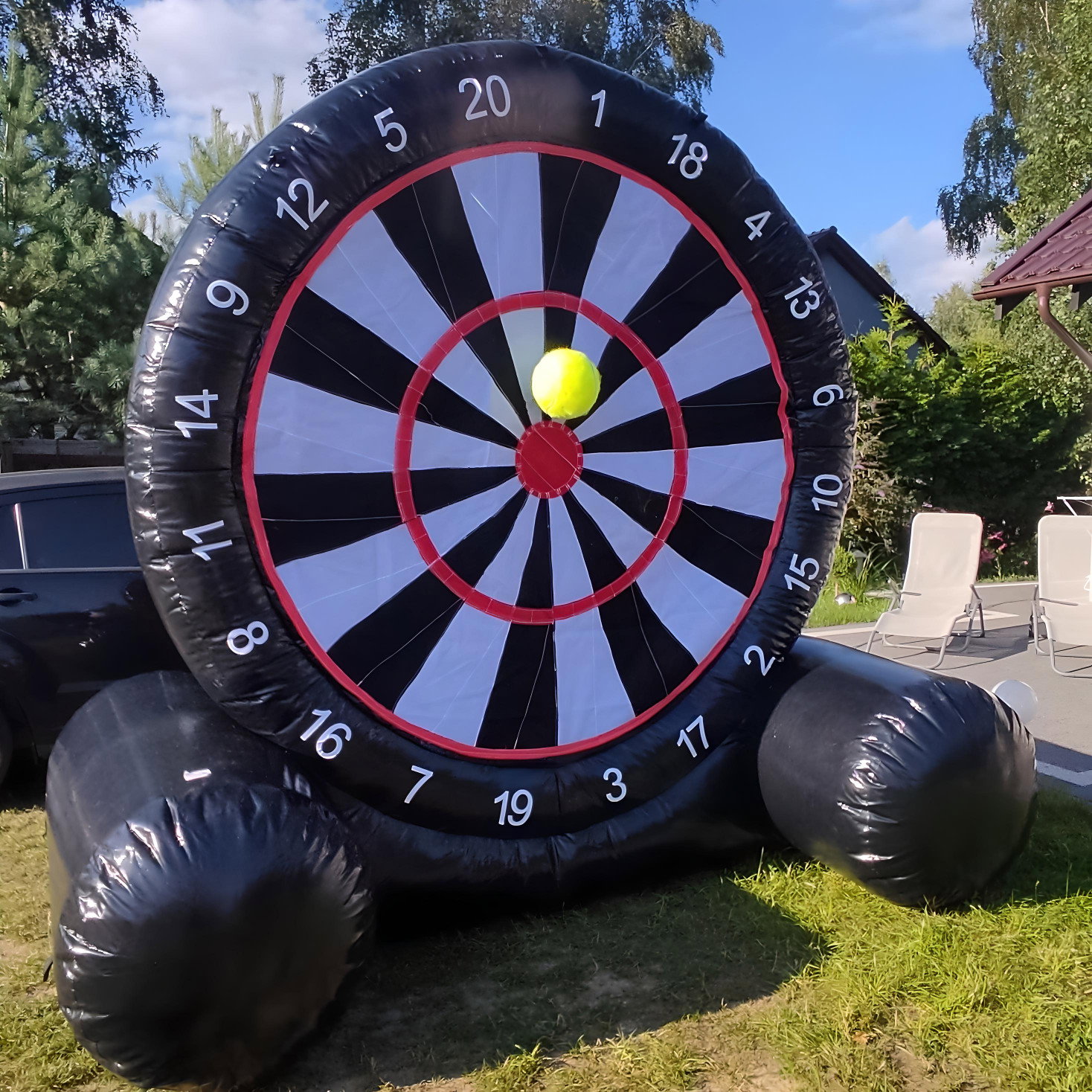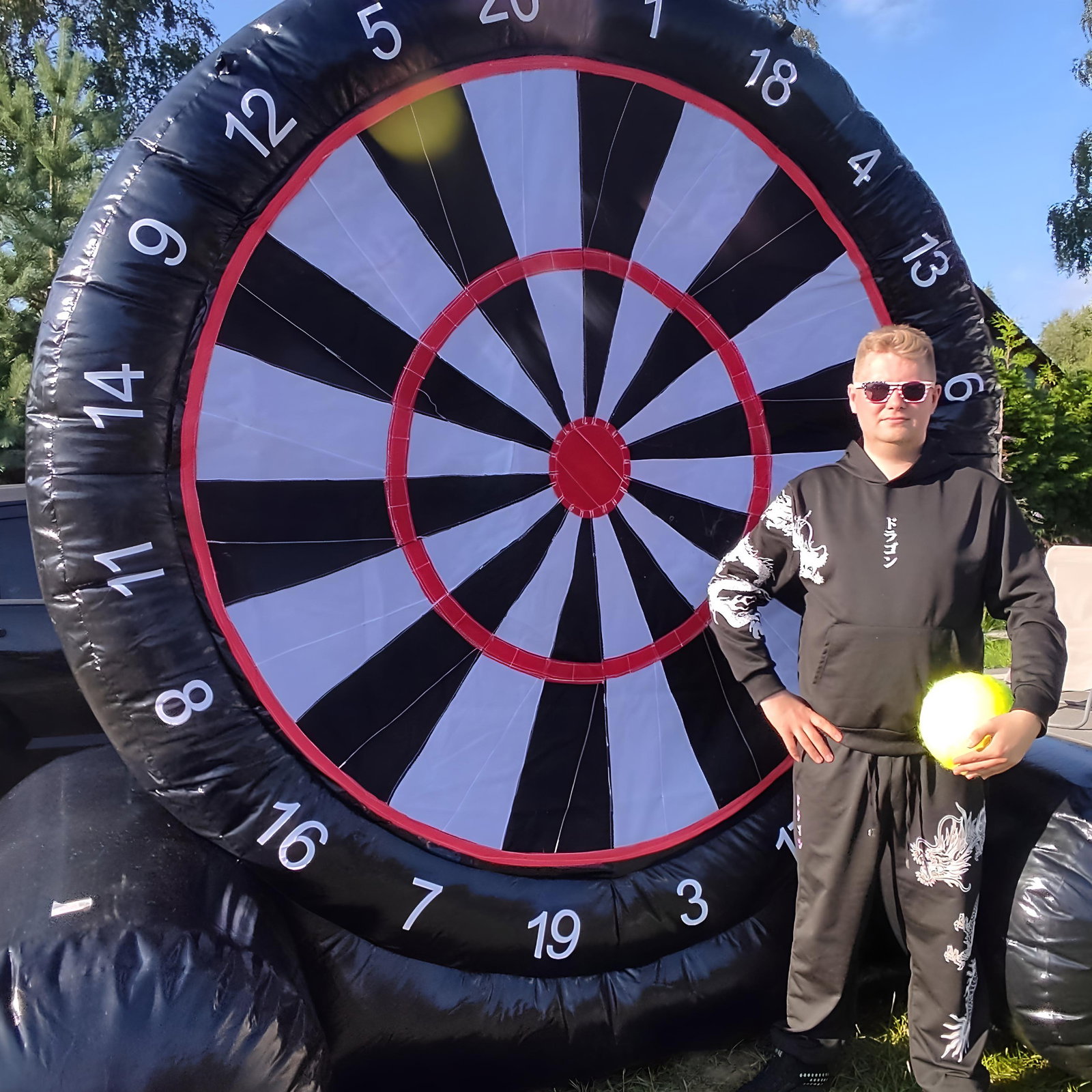 ⚡️Jest to ogromna dmuchana tarcza z wielkimi punktami, na które można rzucać duże dmuchane „darty”, podobne do rzucanych w popularnej grze w darta.