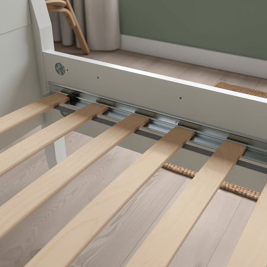 Dno łóżka LURÖY ma lekko wygięte listewki, które dopasowują się do ciężaru ciała. Otwarta konstrukcja umożliwia cyrkulację powietrza, dzięki czemu materac może oddychać i zachować świeżość na dłużej.