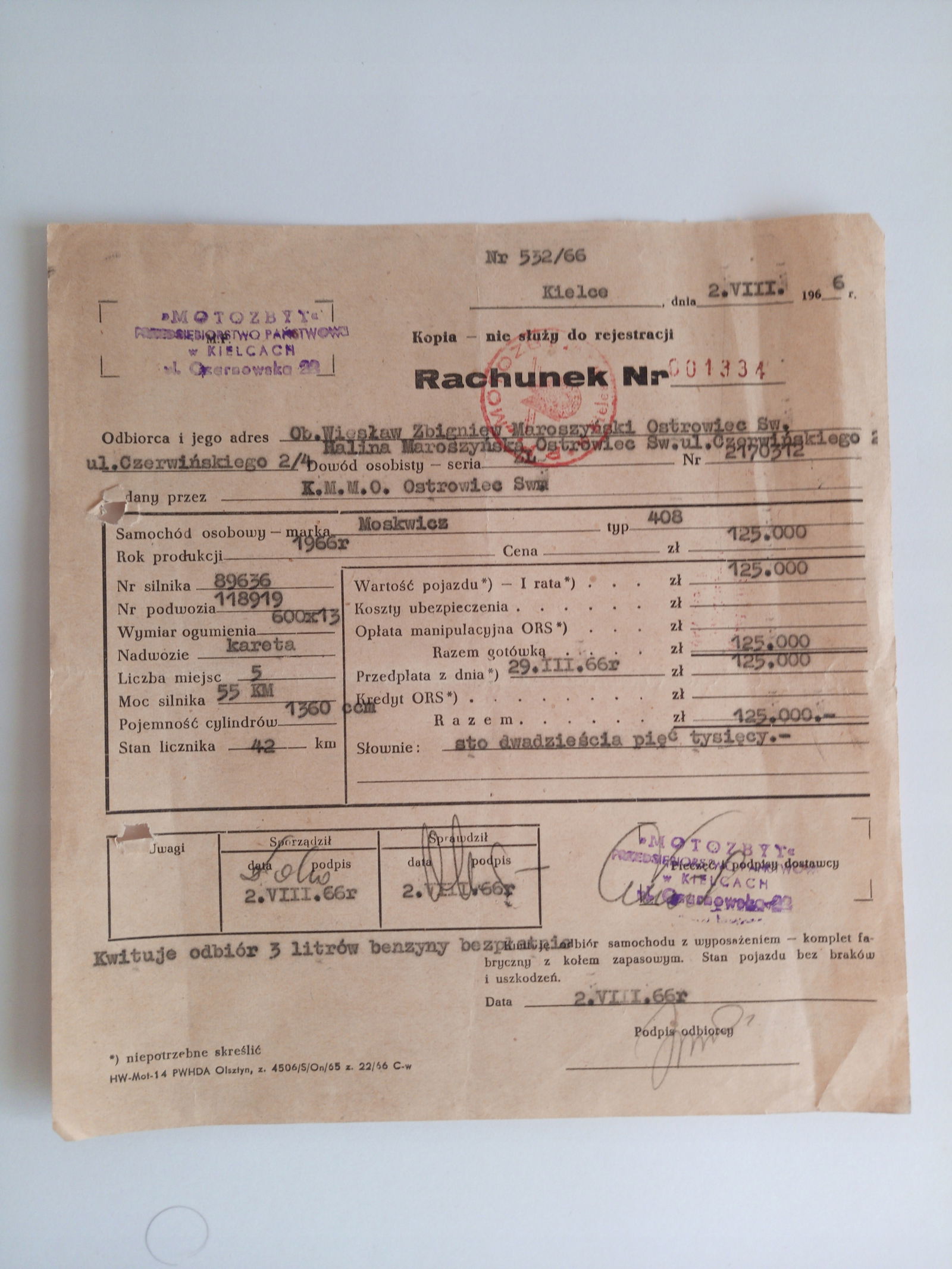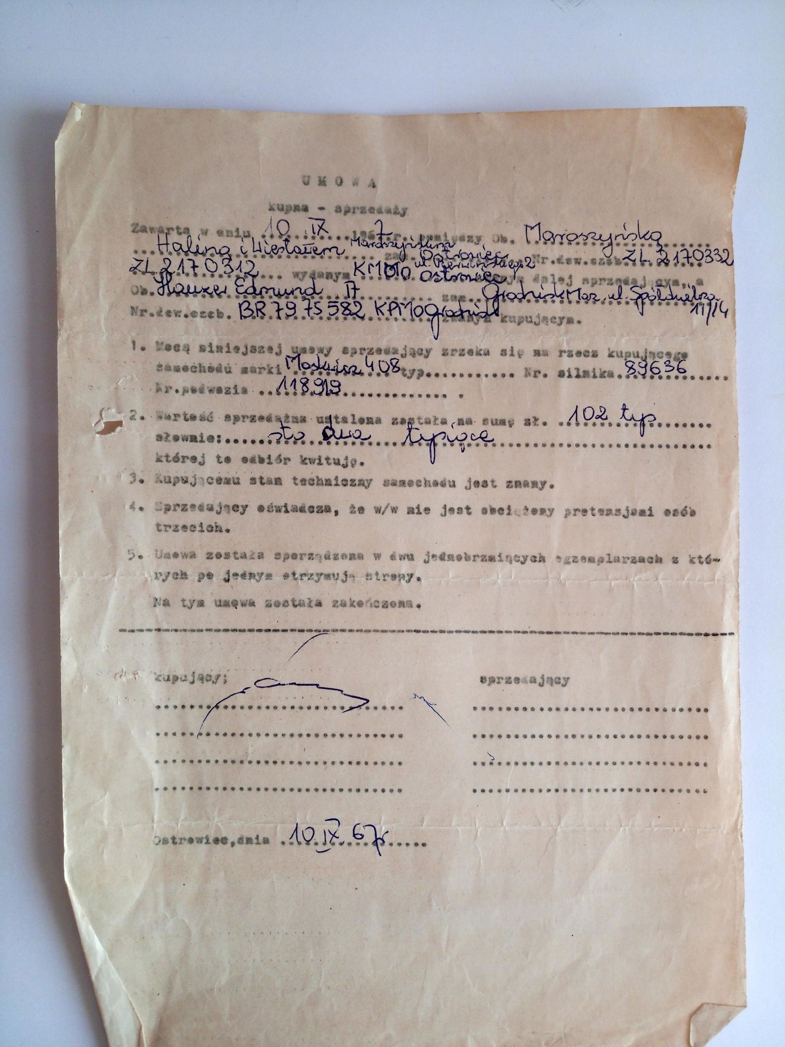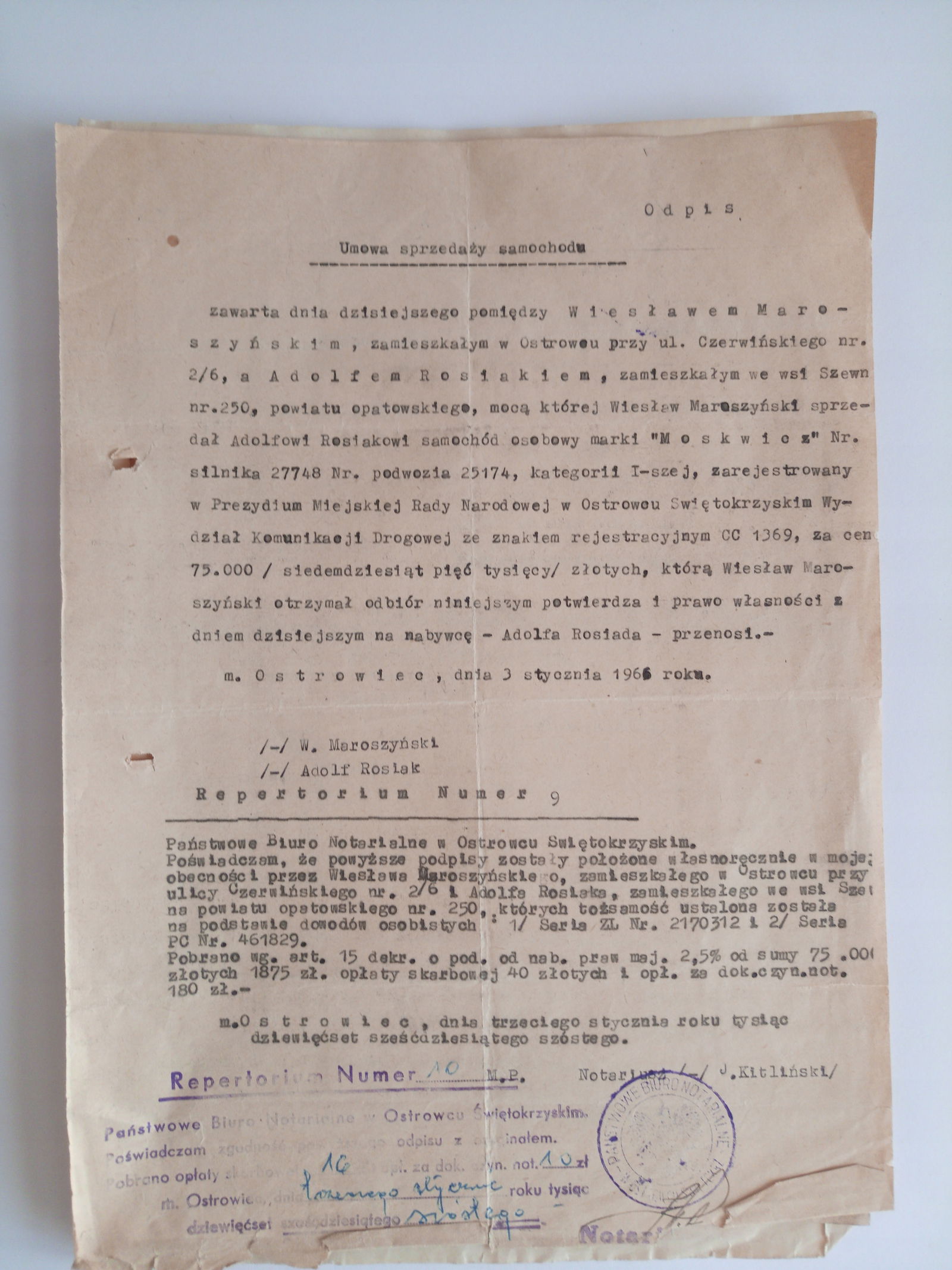 - odpis umowy kupna sprzedaży (inny egzemplarz samochodu Moskwicz - gratis)