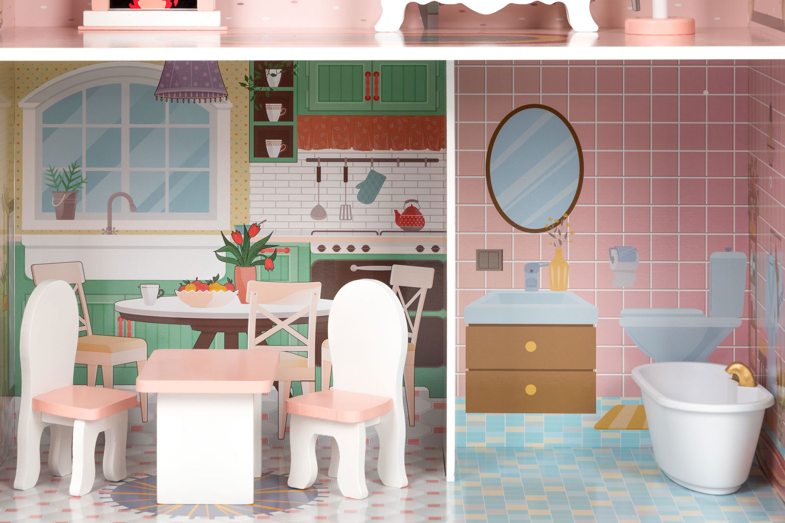 Wystarczy chwila zabawy aby dziecko go pokochało. Cały domek ma 3 niezależne poziomy, w których znajduje się łącznie 5 pomieszczeń, w tym taras umieszczony na najwyższym piętrze. Każde pomieszczenie wykończono w innej stylistyce, wystrój oraz meble zostały dopasowane do charakteru i przeznaczenia danego pomieszczenia. Nic jednak nie stoi na przeszkodzie aby Twoje dziecko pobawiło się w projektanta wnętrz i urządziło je po swojemu.