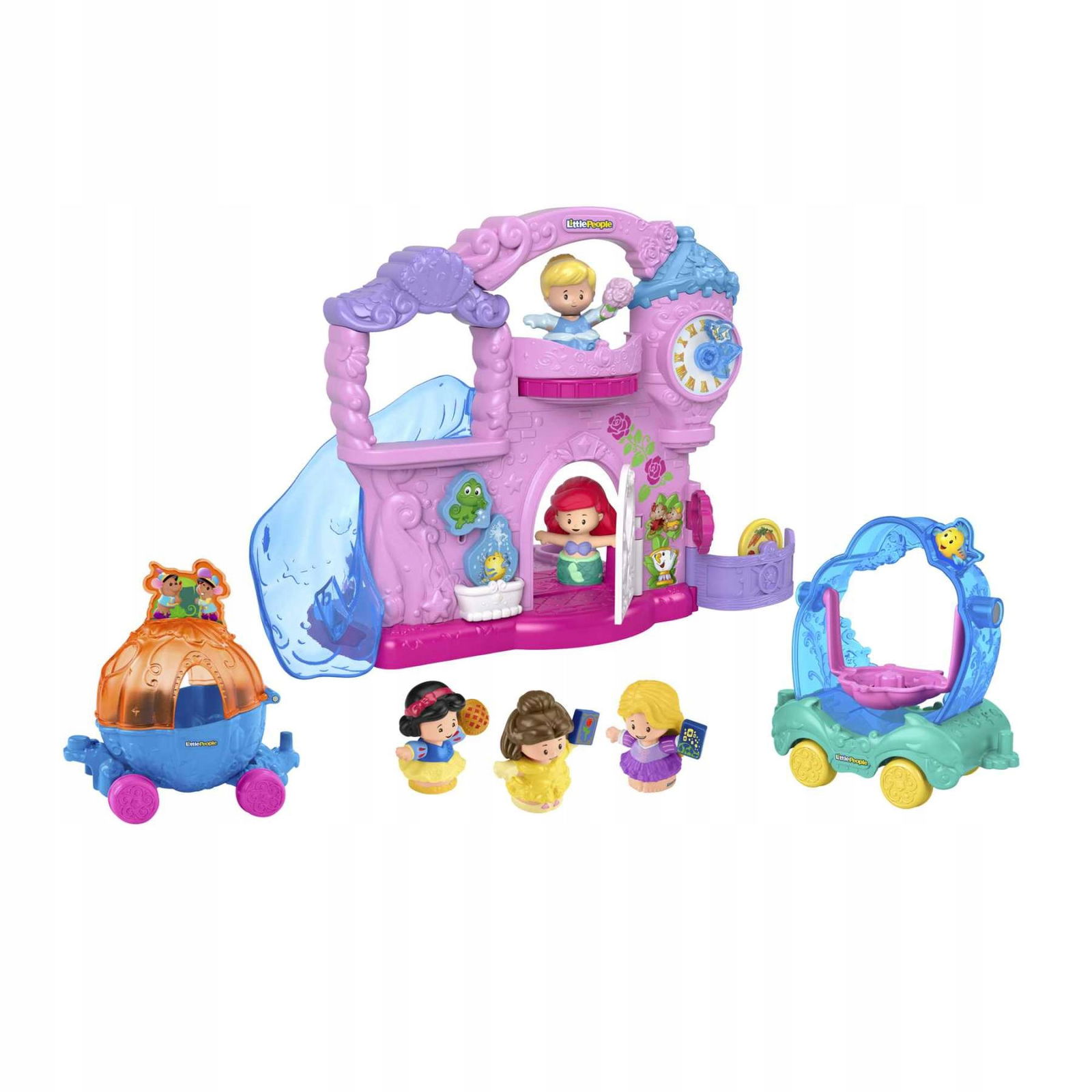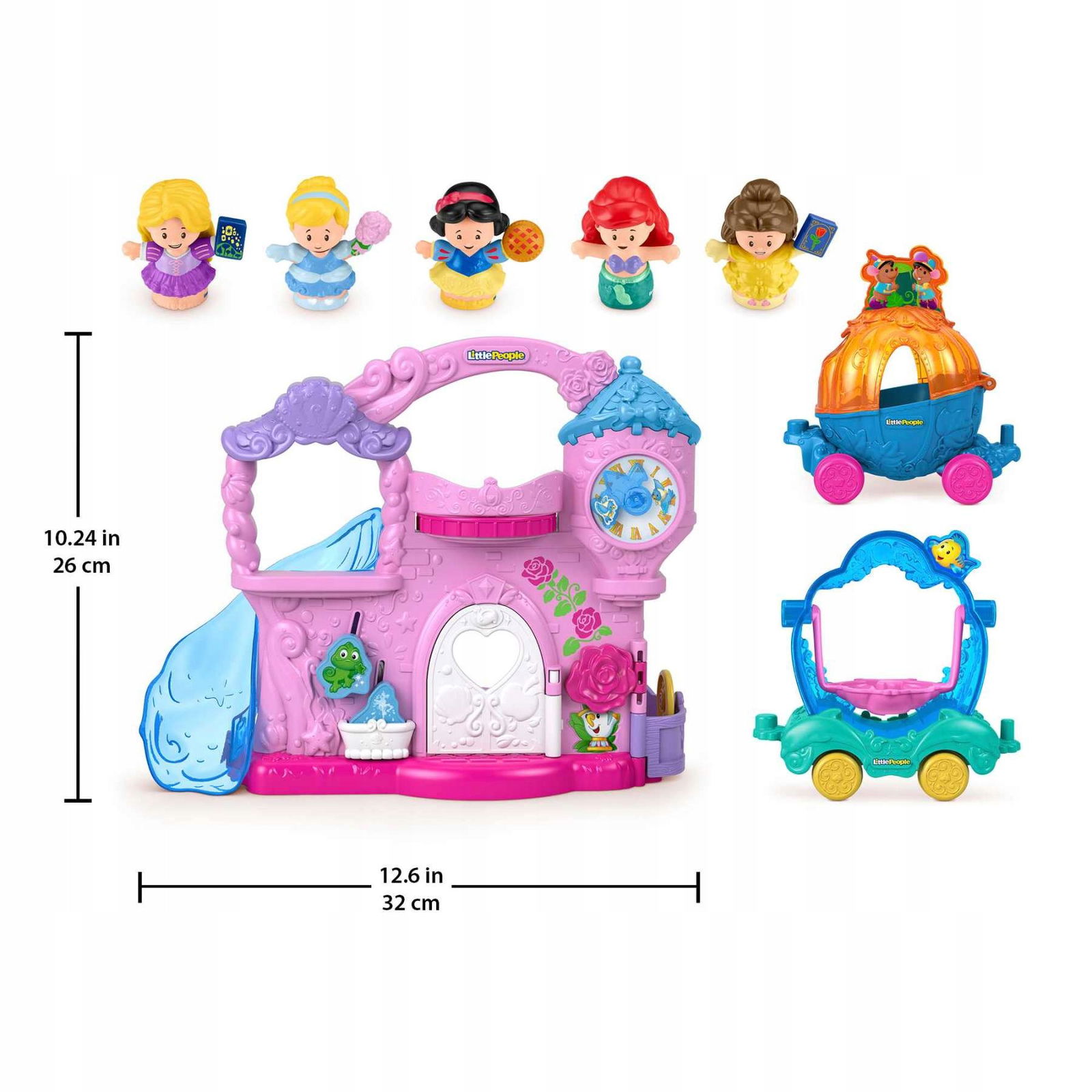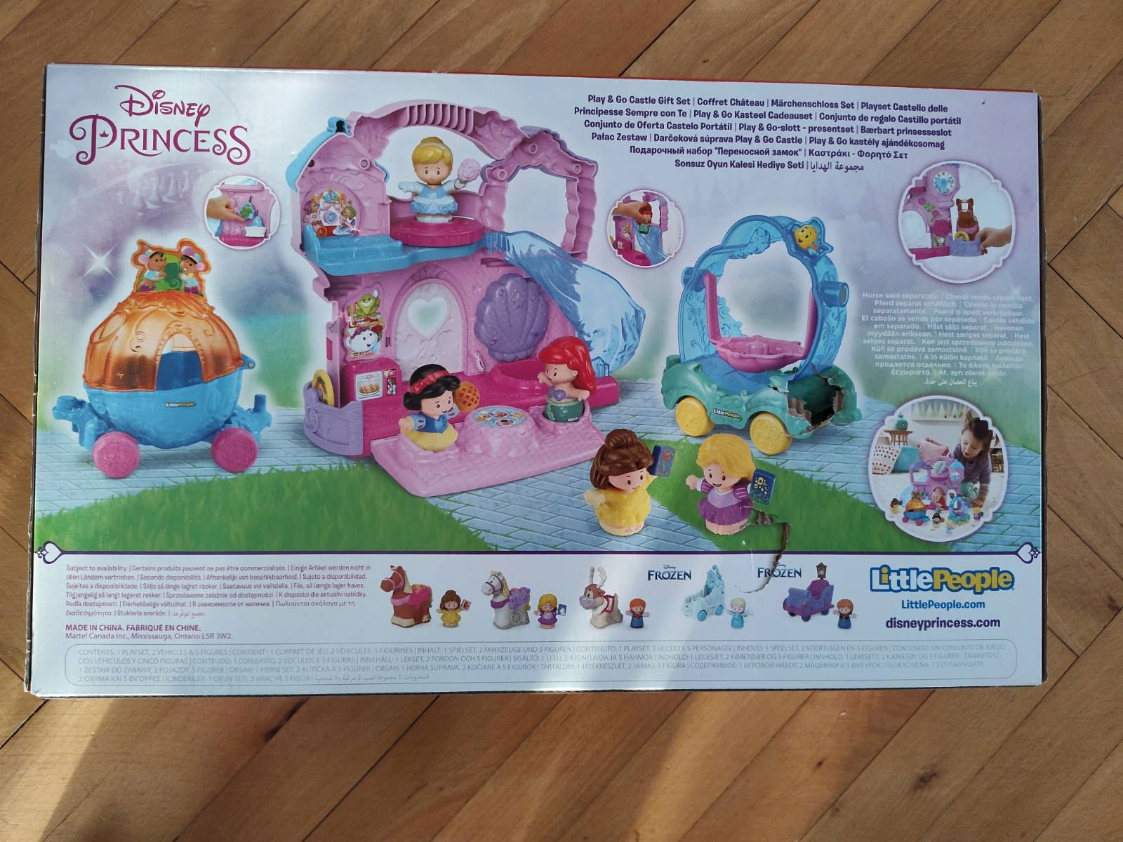 Zawartość: 1 x zestaw do zabawy i zabawy w zamku, 5 x figurki postaci księżniczek Disneya i 2 x popychane pojazdy