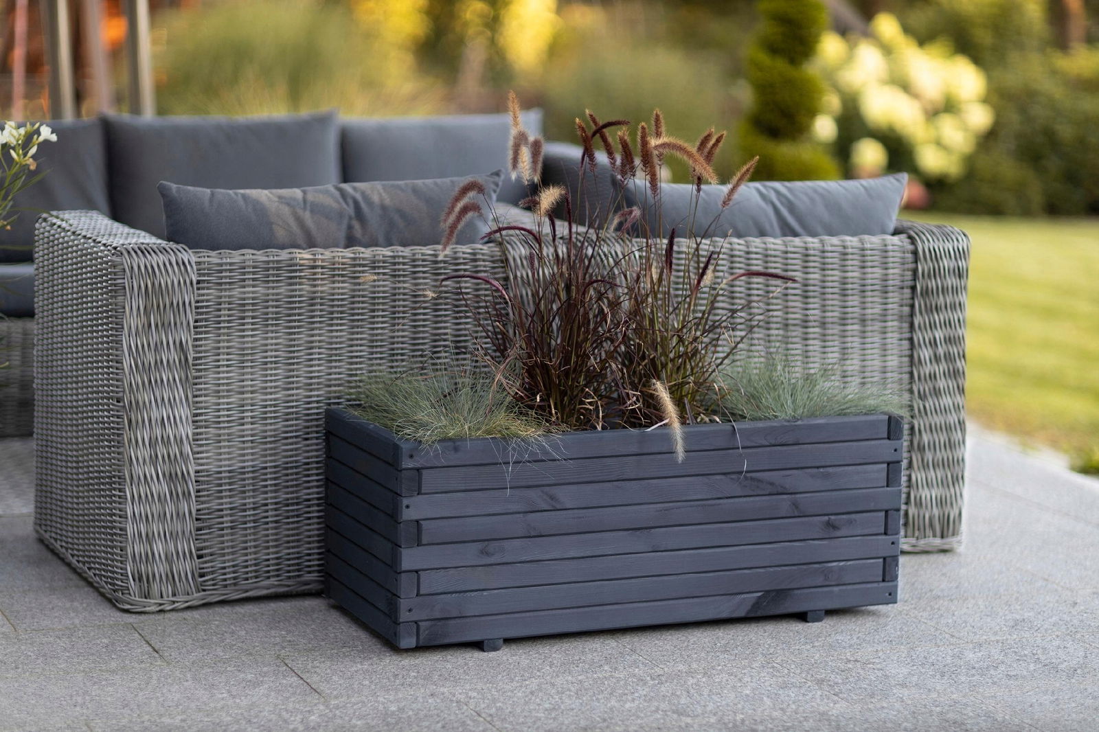 Solidność i styl w Twoim ogrodzie – Donica Drewniana Sosnowa Antracytowa Graphia 90x40x40cm Grubość 3.5cm Wersja złożona