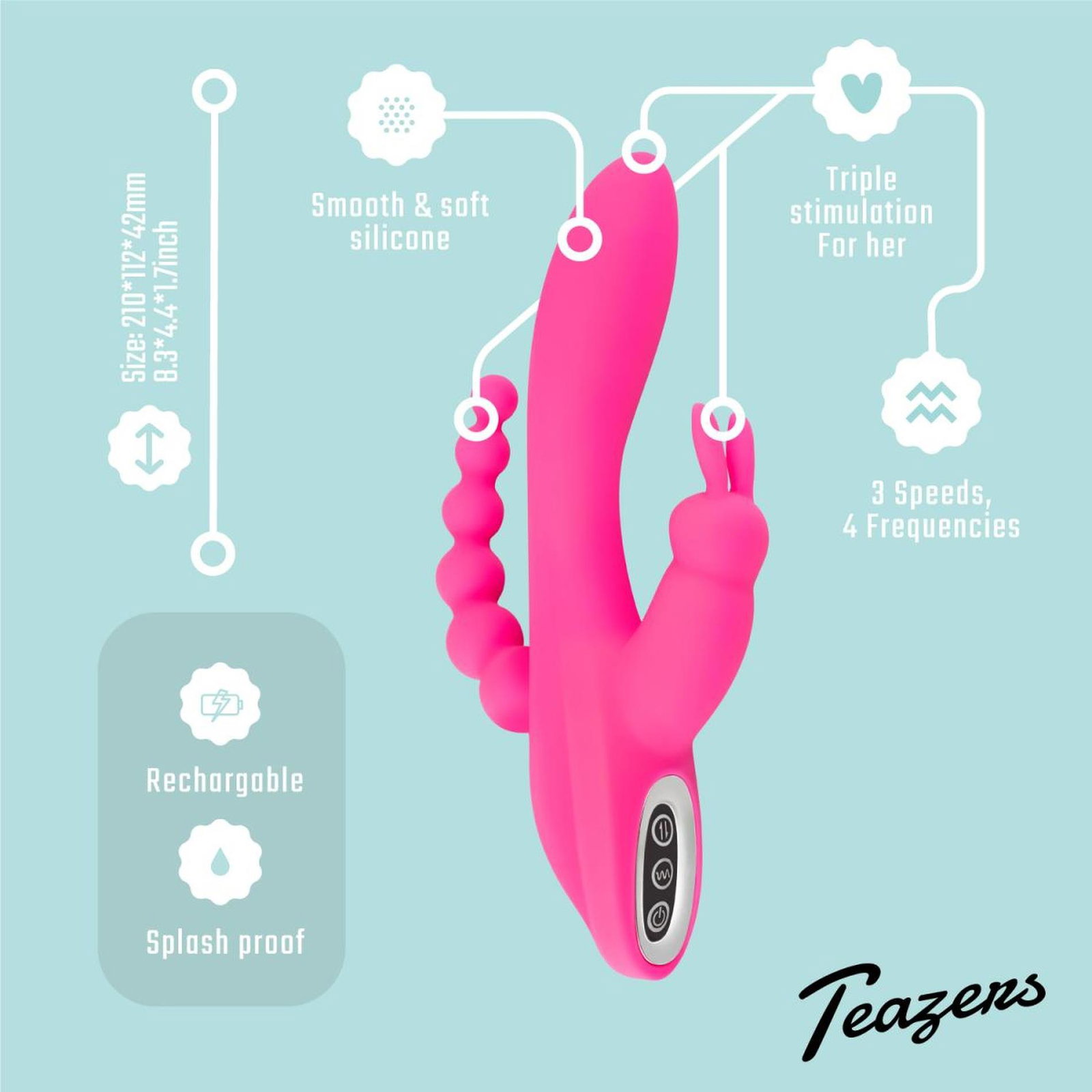 Pozwól sobie na maksymalne doznania dzięki naszemu podwójnemu wibratorowi króliczkowi, który jednocześnie stymuluje łechtaczkę, krocze, punkt G oraz zapewnia intensywną stymulację analną. Wyposażony w 10 potężnych trybów wibracji, które można łatwo kontrolować za pomocą przycisków na podstawie, wibrator oferuje 3 ustawienia wibracji oraz 7 prędkości, dostosowując się do Twoich potrzeb i nastroju.Wibrator jest całkowicie wodoodporny, więc możesz go bezpiecznie używać w wannie lub pod prysznicem, ciesząc się chwilami relaksu i przyjemności. Ładowany przez USB za pomocą dołączonego kabla, jest zawsze gotowy do działania, gdy tylko tego potrzebujesz.Po każdym użyciu należy dokładnie umyć wibrator ciepłą wodą i środkiem czyszczącym do zabawek, a następnie osuszyć go miękką, bezpyłową ściereczką, aby zachować jego higienę.Wymiary:• Całkowita długość: 21 cm• Głębokość penetracji (część waginalna): 12 cm• Minimalna średnica części waginalnej: 3 cm• Maksymalna średnica części waginalnej: 3.8 cm• Głębokość penetracji (część analna): 9 cm• Minimalna średnica części analnej: 1.1 cm• Maksymalna średnica części analnej: 2.1 cmOdkryj niezrównaną przyjemność i kompleksową stymulację, której potrzebujesz, z podwójnym wibratorem typu królik – idealnym towarzyszem do eksploracji swoich pragnień!