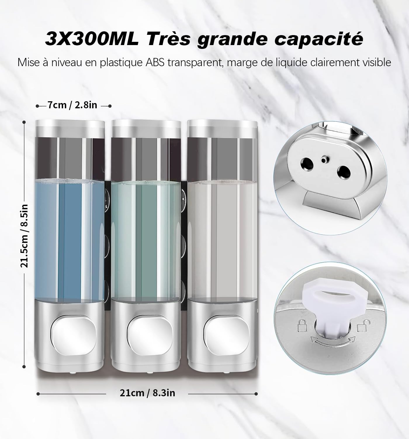 Przezroczysta taśma na obudowie umożliwia szybkie kontrolowanie poziomu mydła. Otwórz i napełnij go za pomocą dołączonego klucza – prosto i skutecznie!