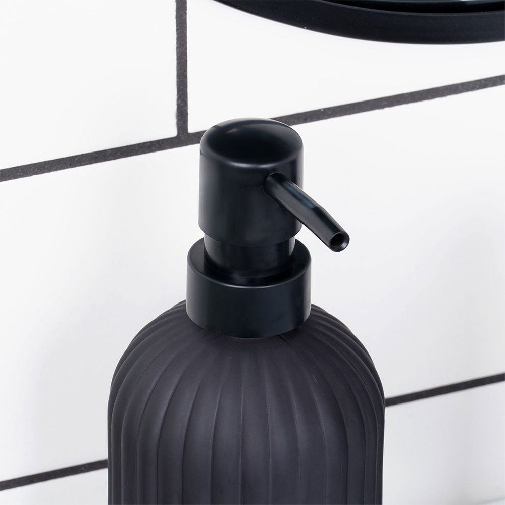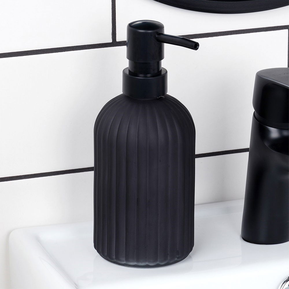 SZKLANY - Dozownik wykonany z najwyższej jakości szkła, które pomalowane jest na czarny, matowy kolor. Pompka wykonana jest z tworzywa w czarnym kolorze. Pojemnik posiada pionowe, tłoczone paski.