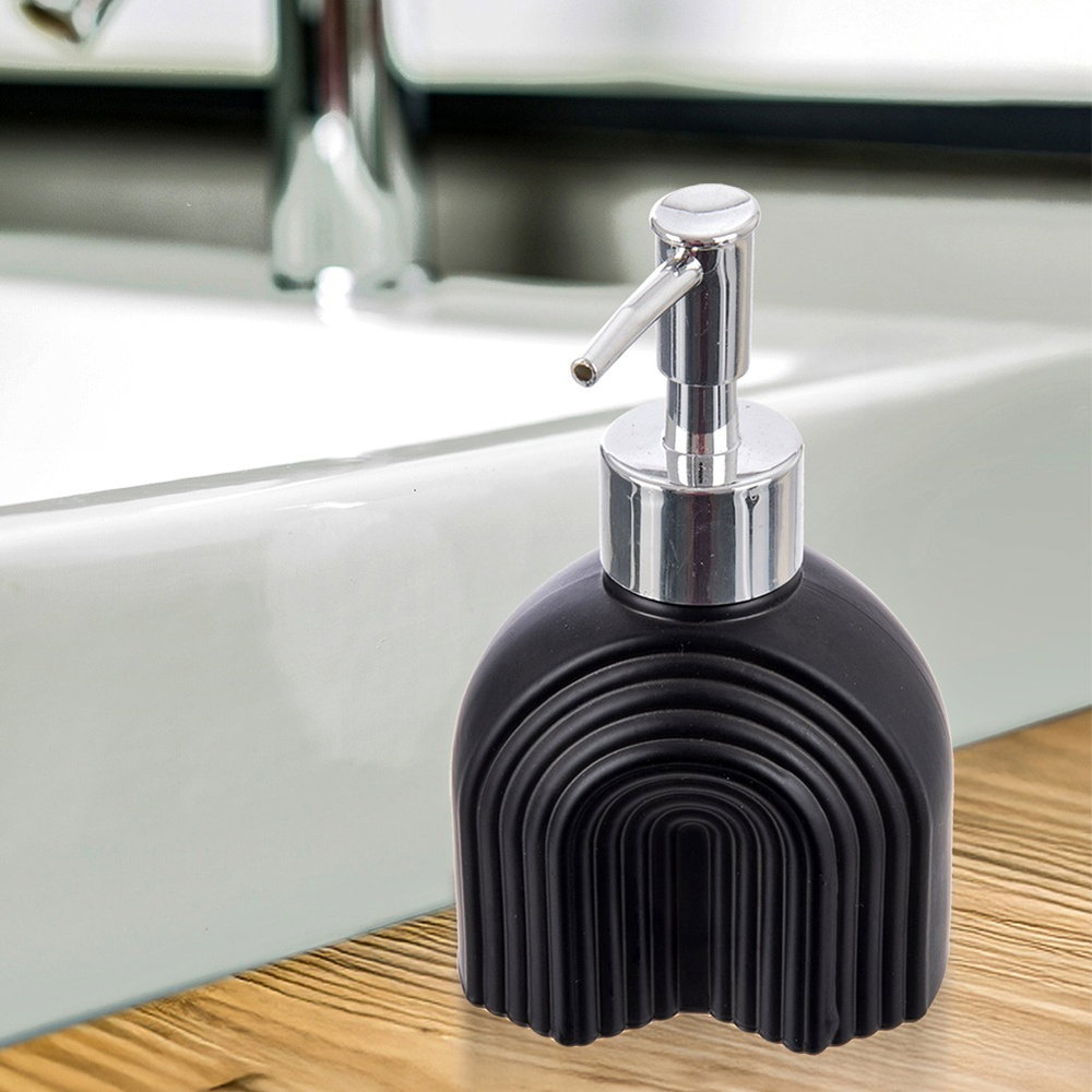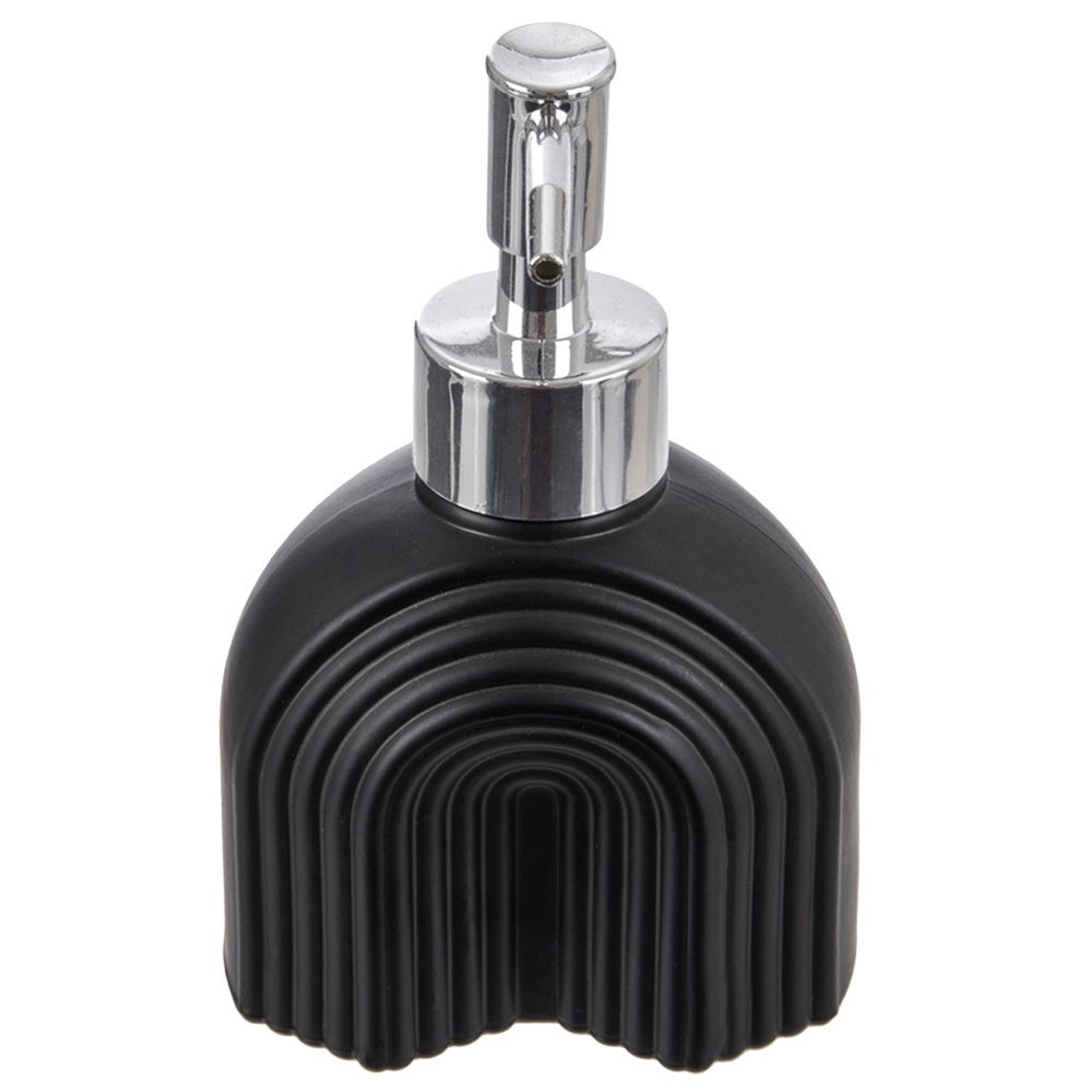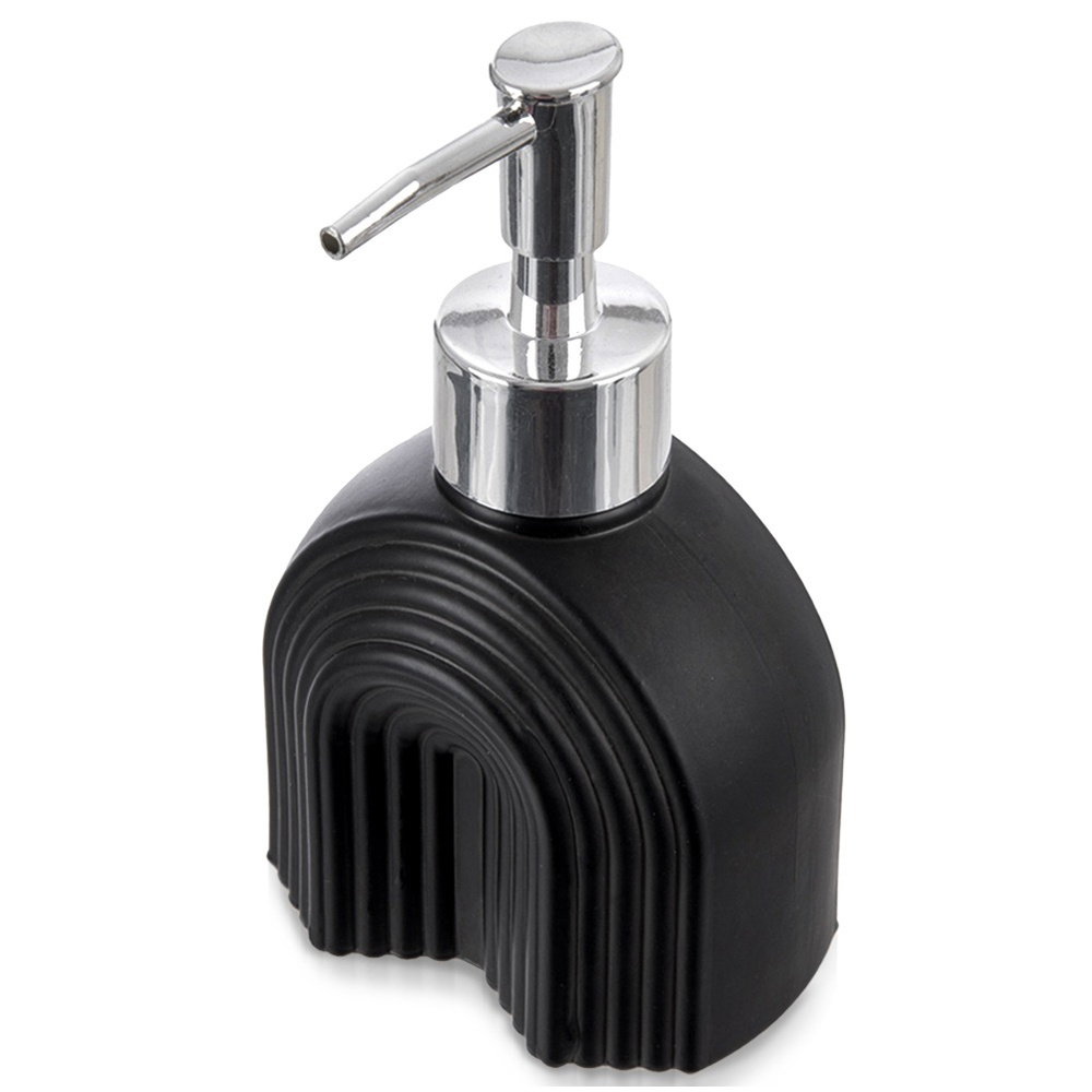 Wykonany ze szkła - Pojemnik wykonany z najwyższej jakości szkła w czarnym, matowym kolorze. Posiada zdobioną powierzchnię i jest przezroczysty, dzięki czemu prezentuje się niezwykle efektownie. Dozownik wykonany jest z tworzywa w srebrnym kolorze.