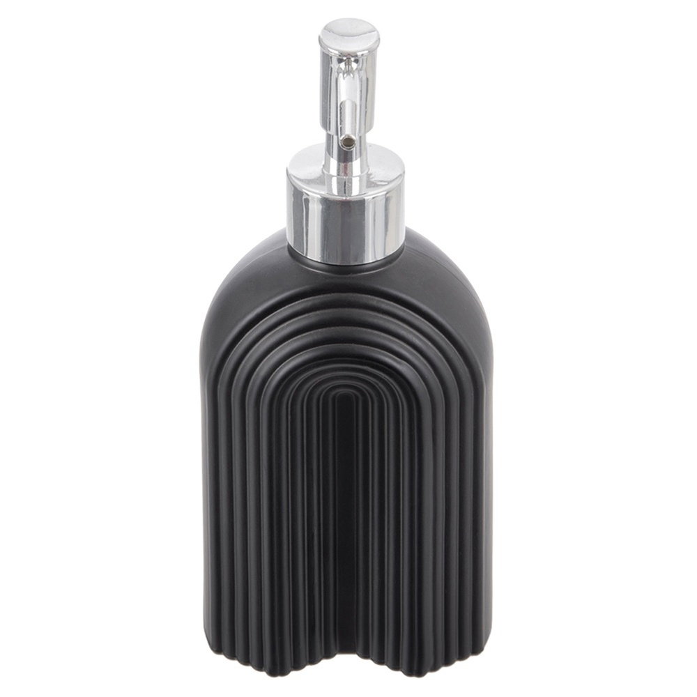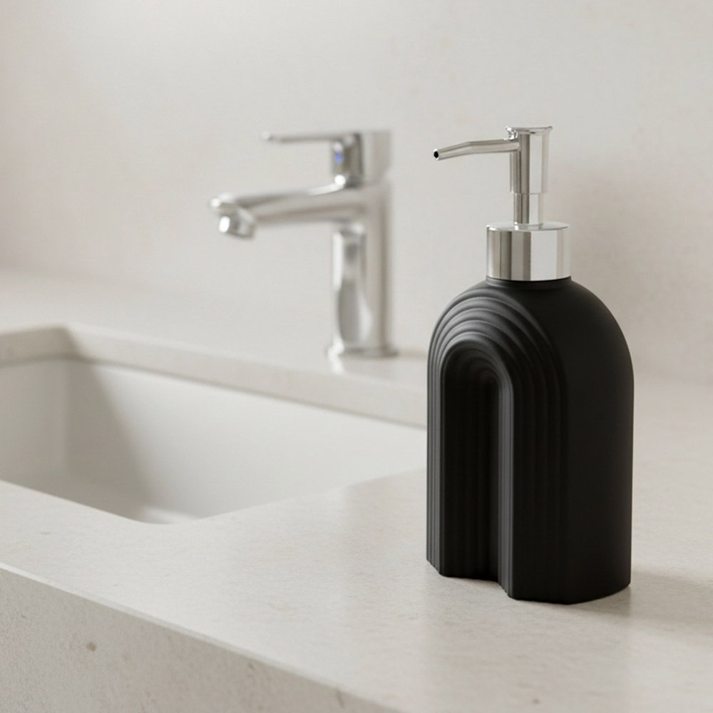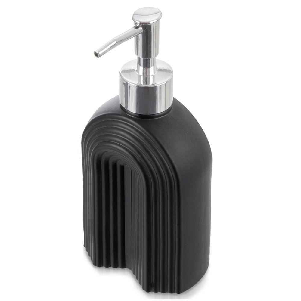 Wykonany ze szkła - Pojemnik wykonany z najwyższej jakości szkła w czarnym, matowym kolorze. Posiada zdobioną powierzchnię i jest przezroczysty, dzięki czemu prezentuje się niezwykle efektownie. Dozownik wykonany jest z tworzywa w srebrnym kolorze.