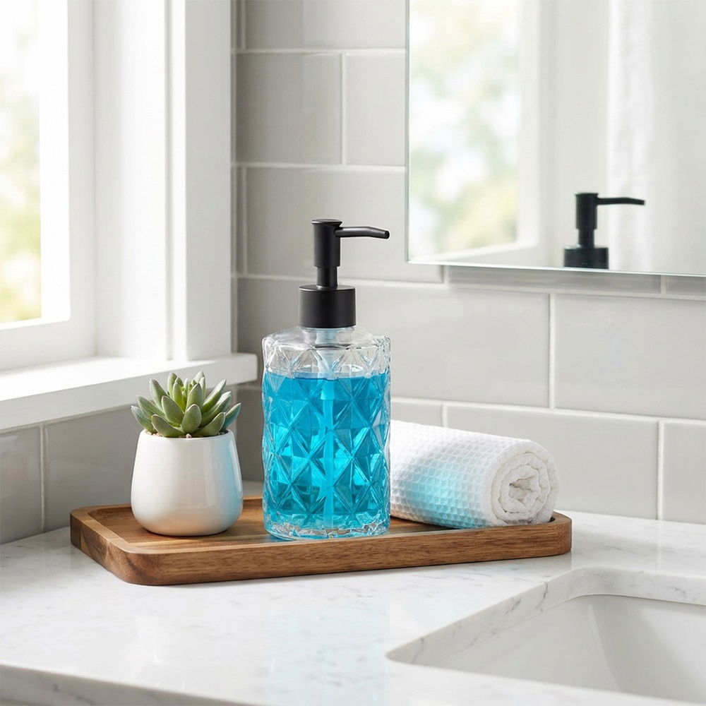 Przezroczyste szkło - Pojemnik wykonany z najwyższej jakości szkła. Posiada zdobioną powierzchnię i jest przezroczysty, dzięki czemu prezentuje się niezwykle efektownie. Dozownik wykonany jest z tworzywa w czarnym kolorze.