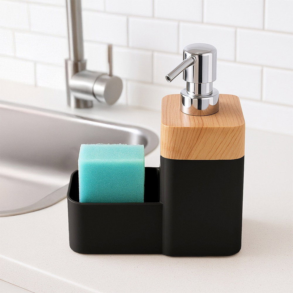 DOZOWNIK PŁYNU DO NACZYŃ KUCHENNY POJEMNIK UCHWYT NA GĄBKĘ ZMYWAK CZARNY
