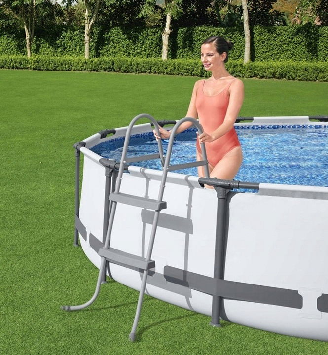 Wyposażona w dwa wytrzymałe antypoślizgowe stopnie, które zapewniają bezpieczne wchodzenie i wychodzenie z basenu, minimalizując ryzyko poślizgnięcia się, nawet gdy stopnie są mokre.