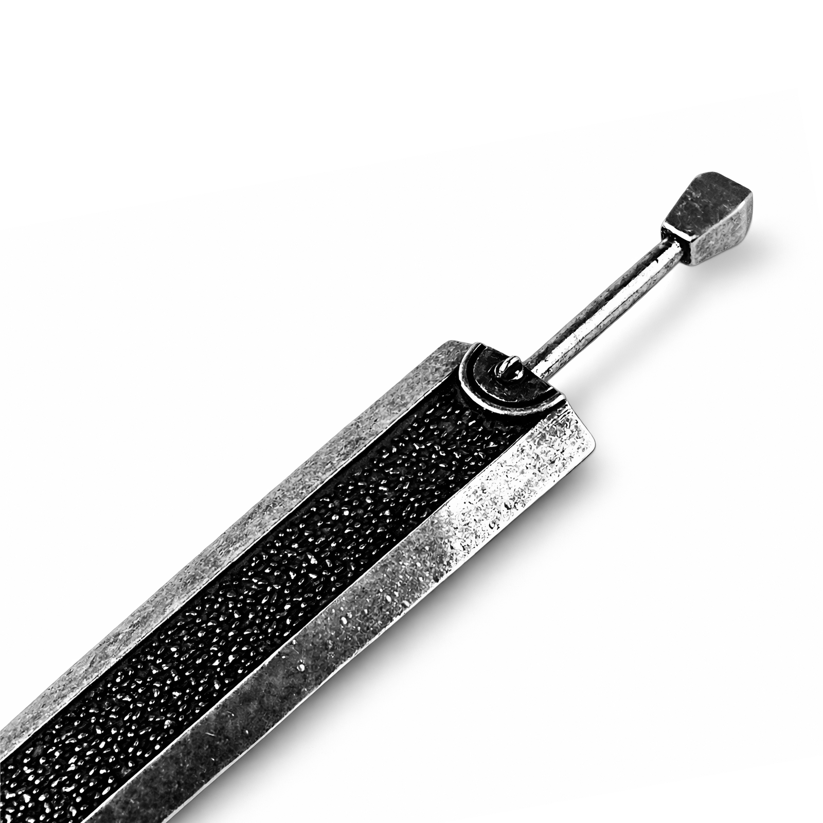 Forma jest prosta, groźna i bardzo „bojowa”: długi, zwężający się ku czubkowi kształt miecza z ostrymi fazami na krawędziach, wykończony w chłodnym srebrno-gunmetalowym odcieniu, jakby metal był już trochę „przeżyty”. Przez środek biegnie czarny pas z chropowatą, ziarnistą fakturą, który dodaje kontrastu i wrażenia surowego, kutego wykończenia. U góry widać okrągły detal mocowania, potem prosty pręt-zawieszkę zakończoną kanciastą końcówką — całość wygląda industrialnie i bardzo pasuje do brutalnej estetyki serii. Podepnij do kluczy, plecaka albo suwaka, albo zawieś przy biurku jako mały talizman „twardości” — gotowy, żeby wejść do Twojego codziennego ekwipunku.