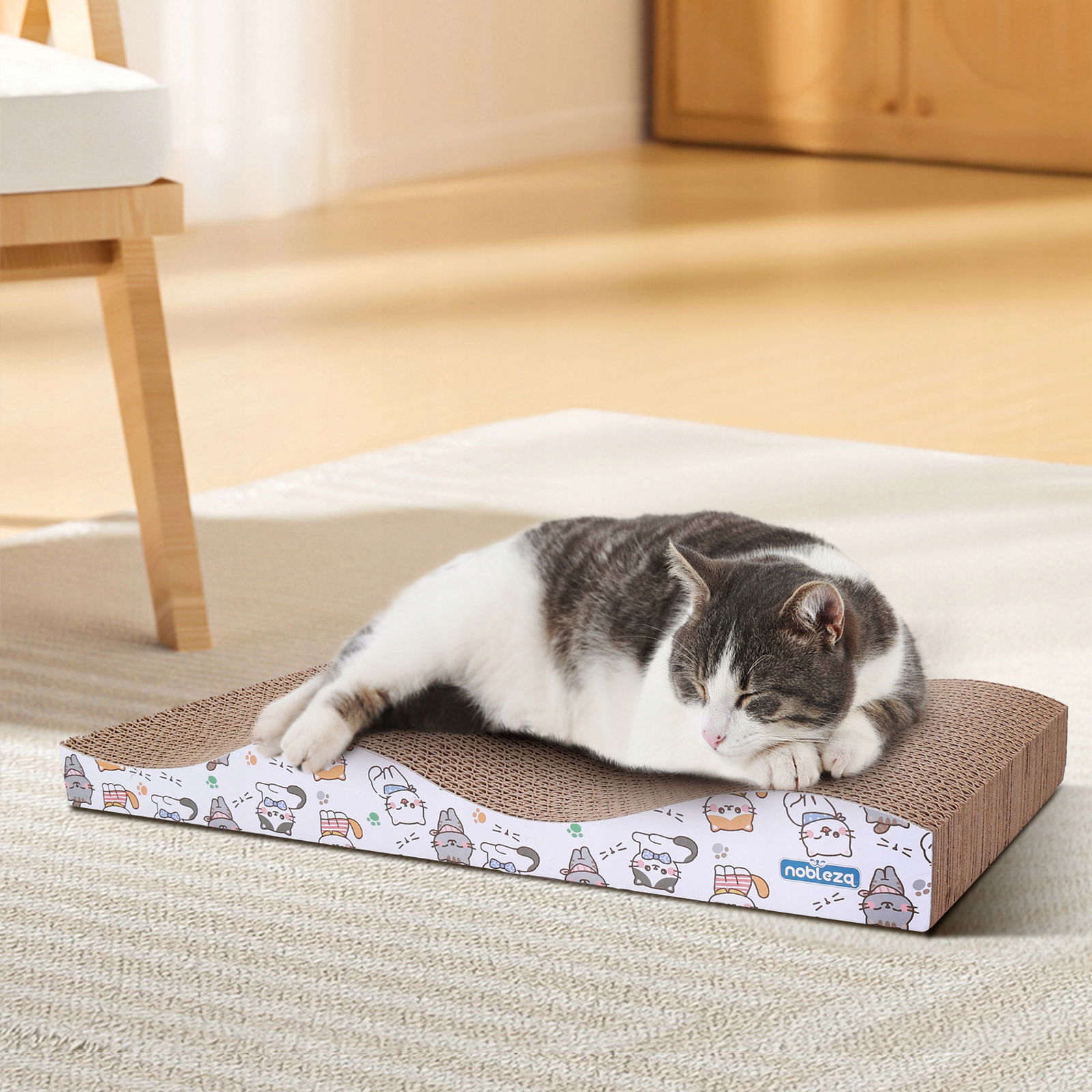 Używanie wysokiej jakości tektury falistej, nietoksycznej, ekologicznej i nietoksycznej, o dużej elastyczności, odporności na ścieranie i zarysowania, nie uszkodzi kociego pazura.