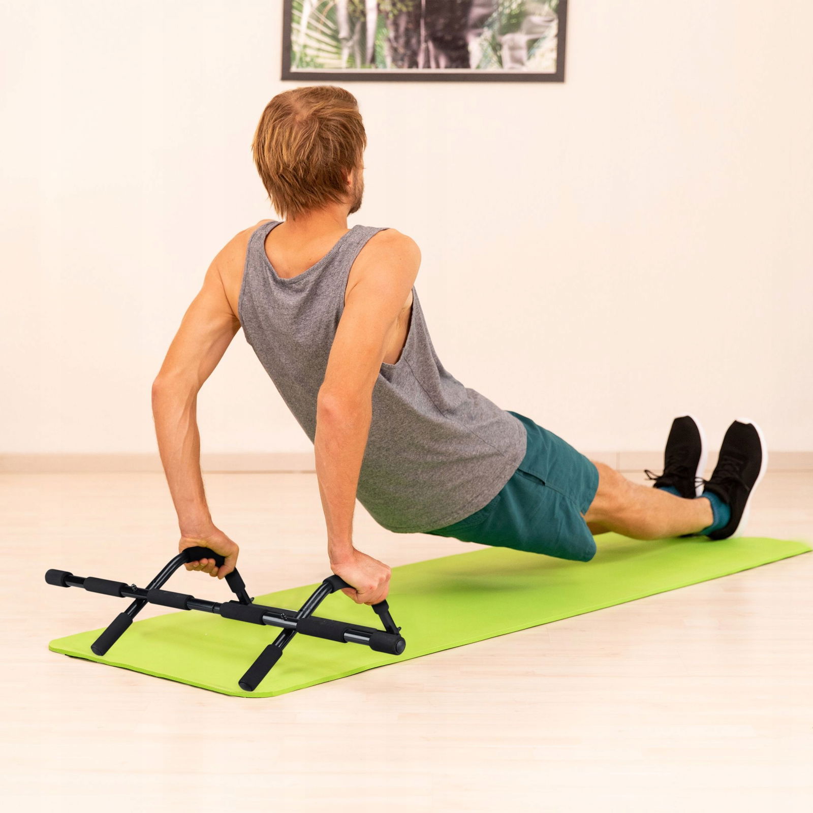 ❇️ Sprzęt można także wykorzystać na podłodze do wielu ćwiczeń. Funkcja 3 w 1 sprawia, że drążek szybko zamienia się w poręcze do dipów lub uchwyty do pompek, umożliwiając skuteczne wzmacnianie różnych partii mięśni.