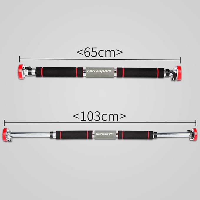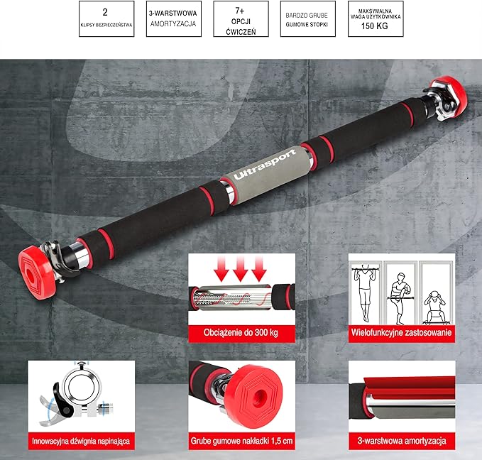 Drążek do podciągania Ultrasport z okrągłym systemem mocowania zapewnia lepsze bezpieczeństwo i przyczepność podczas użytkowania, szeroki gumowy pierścień zapewnia optymalne rozłożenie ciężaru
