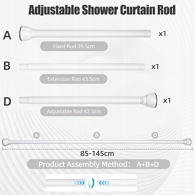 - Wysuwane karnisze: Drążek prysznicowy pasuje do odległości od ściany 85-145cm.