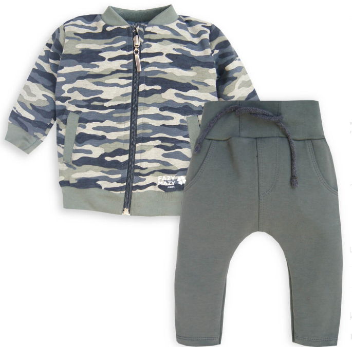 Dres składający się z bluzy i spodenek. Uszyty z mięciutkiej bawełny 95% i elastanu 5%. Elastan. Bluza ma dwie praktyczne kieszonki na przodzie, a rozpinana jest po całości, na środku na zamek błyskawiczny. Spodenki są w kolorze oliwkowym . Posiadają dwie kieszonki, a dodatkowo w ozdobny sznureczek przy ściągaczu. Elastyczny ściągacz w pasie utrzymuje je na swoim miejscu.