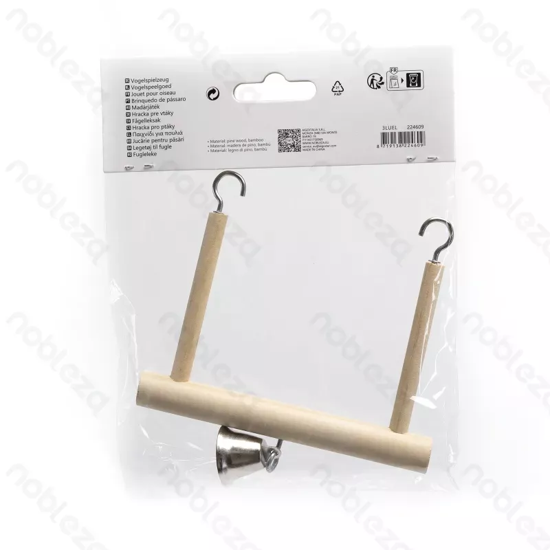 Zabawka dla ptaków z dzwonkiem. Wykonana z drewna sosnowego i bambusa, które jest bezpieczne dla ptaków. Metalowe haczyki pozwalają na jej podwieszenie w klatce.
