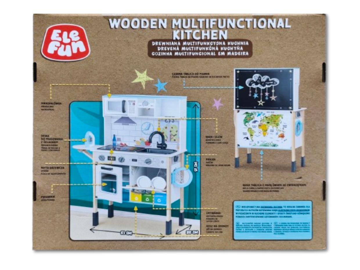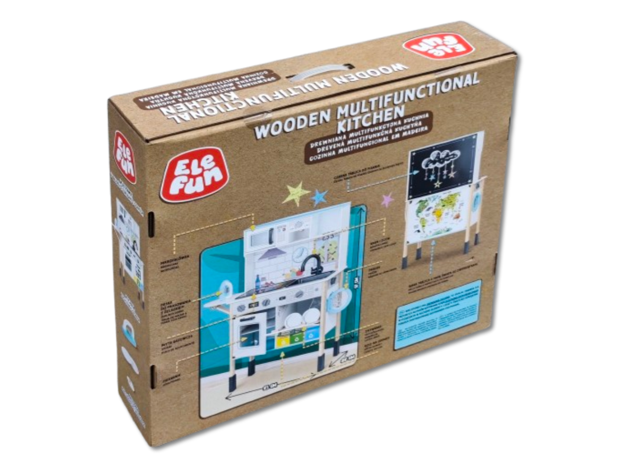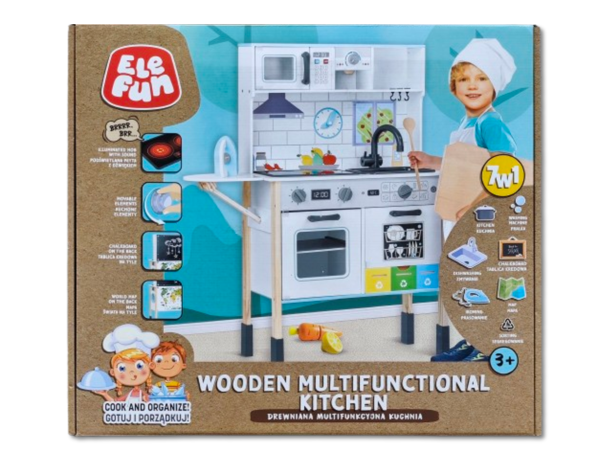 Drewniana kuchnia do zabawy marki Elefun o wymiarach 28x81x97cm, która z pewnością zapewni świetną zabawę, oraz dużo przyjemności każdej małej gospodyni, wspomagając przy tym kreatywność i fantazję. Solidna konstrukcja z prawdziwego drewna, sklejki oraz płyty MDF zapewnia stabilność, wytrzymałość oraz bezpieczeństwo użytkowania. Zabawka posiada otwierany piekarnik z ruchomymi pokrętłami, otwieraną zmywarkę, 3 szufladki (kosze) w kolorach żółtym, zielonym i niebieskim pod zmywarką, zlew z kranem, elektroniczną płytę z podświetlanymi palnikami i efektami dźwiękowymi symulującymi gotowanie. Kuchnia posiada także mikrofalówkę, pralkę, półkę, wieszaczki, deskę do prasowania z żelazkiem oraz w tylnej części kredową tablicę, i białą tablicę z mapą świata. Płyta elektroniczna zasilana jest 2 bateriami AA 1,5V (duże paluszki), które nie są dołączone do zestawu. Zabawka posiada certyfikaty CE, FSC, TUVRheinland i jest przeznaczona dla dzieci powyżej 3 roku życia.