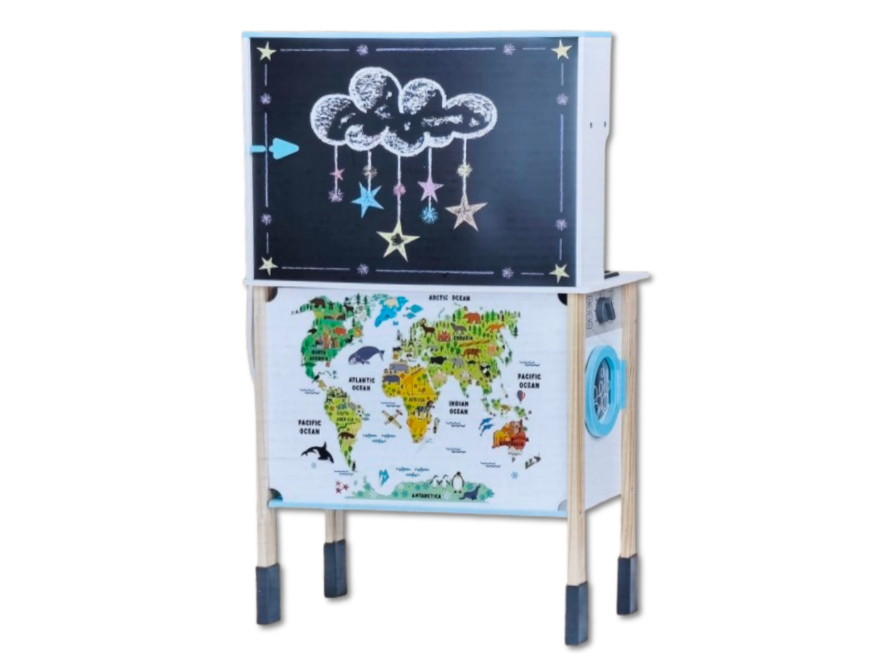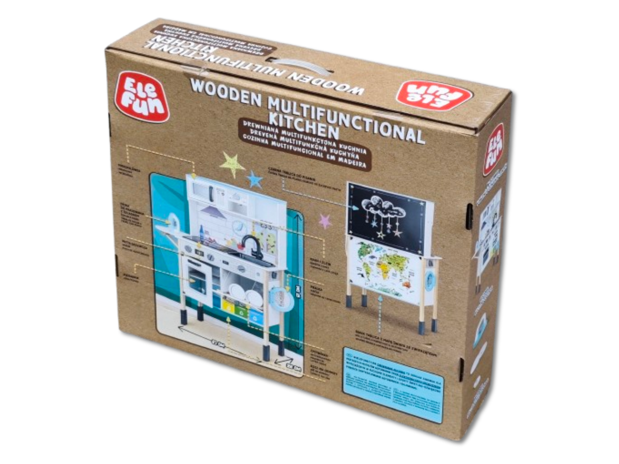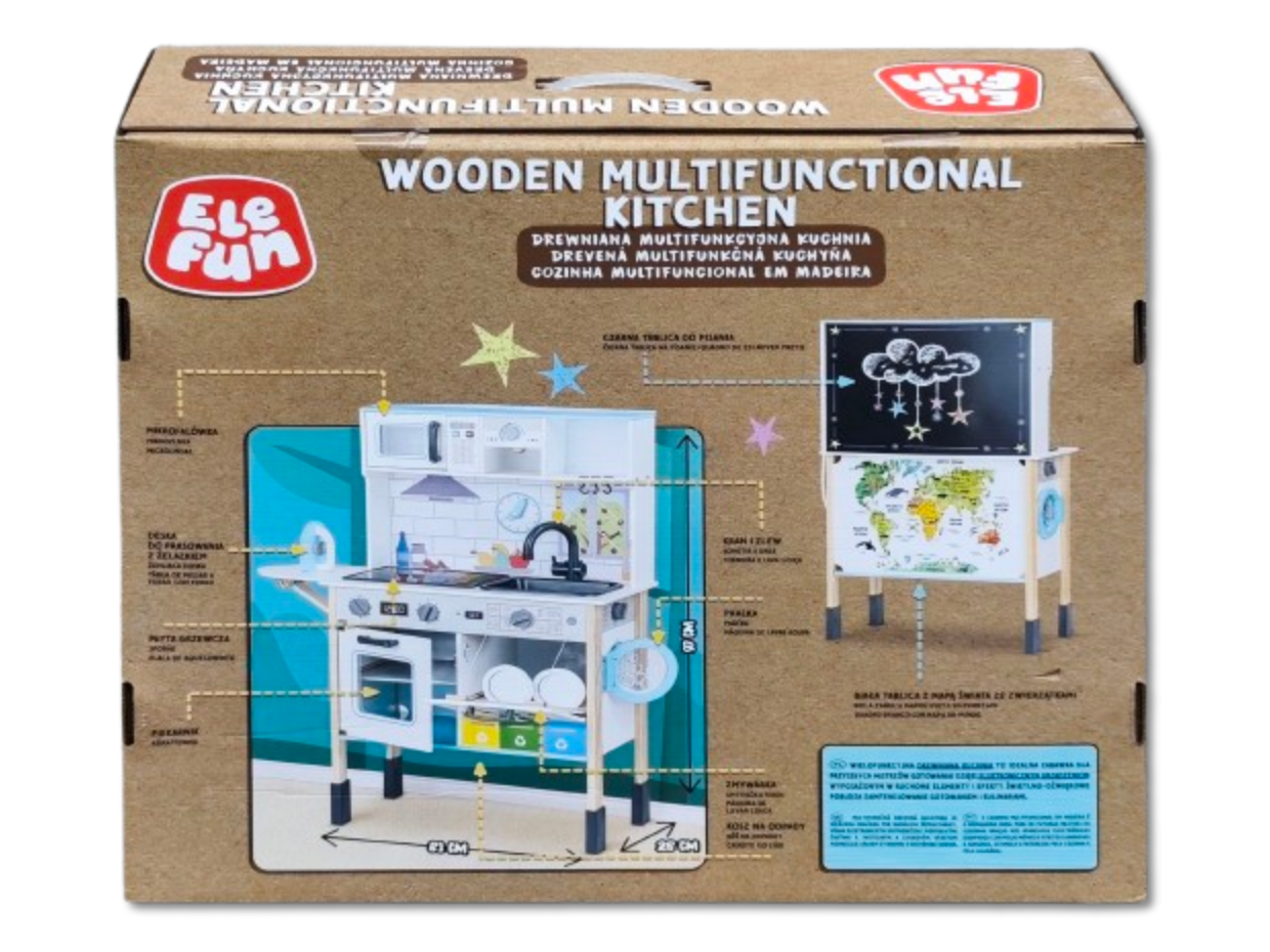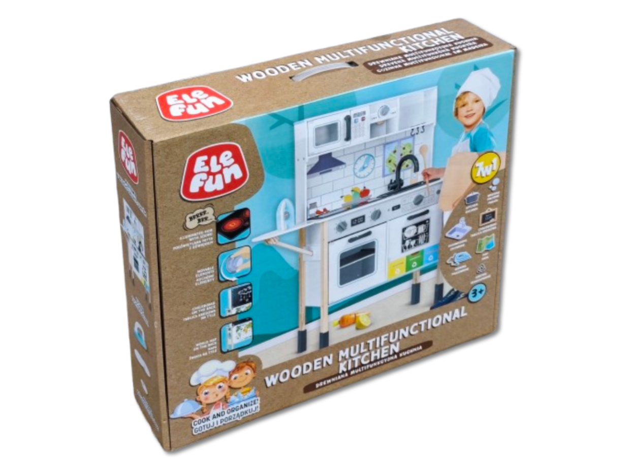 Drewniana kuchnia do zabawy marki Elefun o wymiarach 28x81x97cm, która z pewnością zapewni świetną zabawę, oraz dużo przyjemności każdej małej gospodyni, wspomagając przy tym kreatywność i fantazję. Solidna konstrukcja z prawdziwego drewna, sklejki oraz płyty MDF zapewnia stabilność, wytrzymałość oraz bezpieczeństwo użytkowania. Zabawka posiada otwierany piekarnik z ruchomymi pokrętłami, otwieraną zmywarkę, 3 szufladki (kosze) w kolorach żółtym, zielonym i niebieskim pod zmywarką, zlew z kranem, elektroniczną płytę z podświetlanymi palnikami i efektami dźwiękowymi symulującymi gotowanie. Kuchnia posiada także mikrofalówkę, pralkę, półkę, wieszaczki, deskę do prasowania z żelazkiem oraz w tylnej części kredową tablicę, i białą tablicę z mapą świata. Płyta elektroniczna zasilana jest 2 bateriami AA 1,5V (duże paluszki), które nie są dołączone do zestawu. Zabawka posiada certyfikaty CE, FSC, TUVRheinland i jest przeznaczona dla dzieci powyżej 3 roku życia.