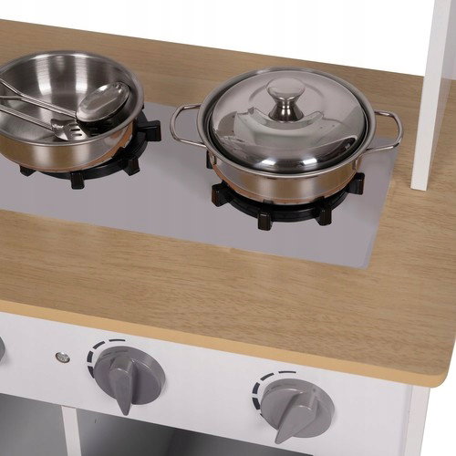 Drewniana kuchnia zabawkowa posiada modny nowoczesny wygląd, który doceni każdy dorastający kuchmistrz. Posiada imitację dwóch palników, na których można ugotować pyszne potrawy. Po przekręceniu gałek usłyszymy charakterystyczny klik. Po skończonym posiłku trzeba jeszcze umyć naczynia korzystając ze zlewu.