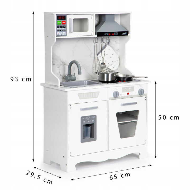 - Na drzwiach lodówki umieszczono dozownik wody i kostkarkę lodu. W komplecie z kuchnią znajduje się kubek i dwa drewniane klocki, które idealnie imitują kostki lodu.