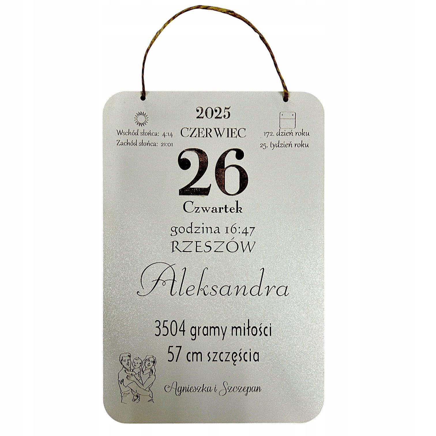 ? Personalizacja: Metryczka zawiera imię dziecka, datę narodzin, godzinę, wagę oraz długość przy urodzeniu.