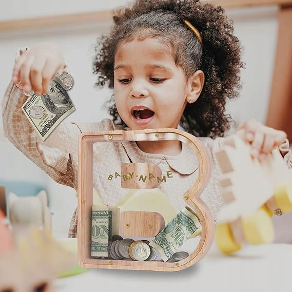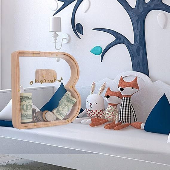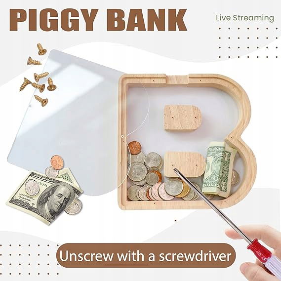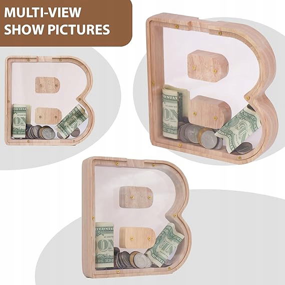 LEcylankEr Skarbonka z drewnianych liter, przezroczysta świnka skarbonka dla dzieci, spersonalizowana, kreatywna ławka na prezent urodzinowy, dekoracja domu, keepsake (rozmiar uniwersalny, B)