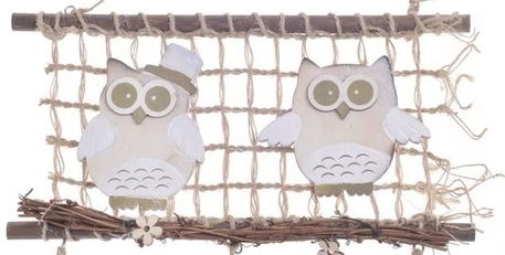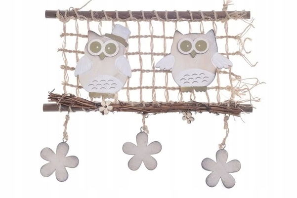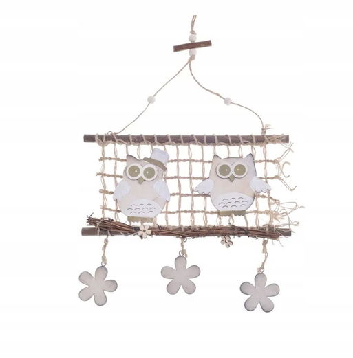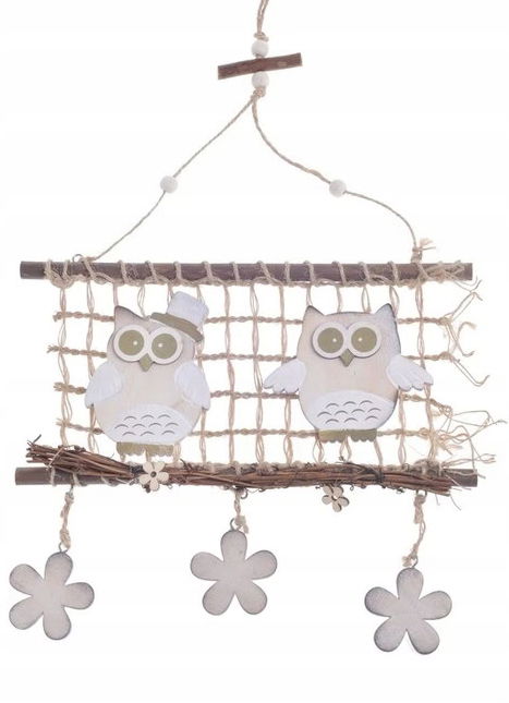 Przedstawiamy uroczą dekorację wiszącą z sówkami, która doda przytulnego charakteru każdemu wnętrzu. Ta starannie wykonana ozdoba przedstawia dwie sowy siedzące na gałązce, a za nimi rozpościera się delikatna siatka ze sznurków. Dodatkowym akcentem są trzy kwiatki zawieszone na sznurkach poniżej, które wprowadzają wiosenny nastrój.