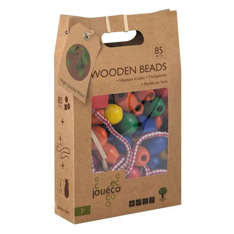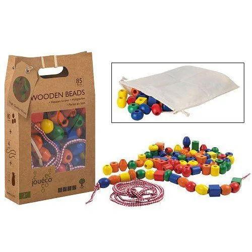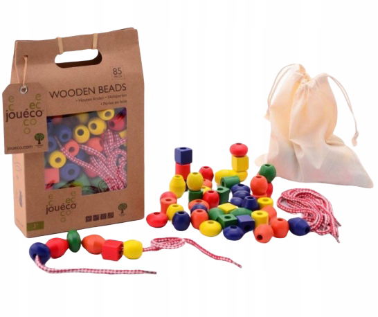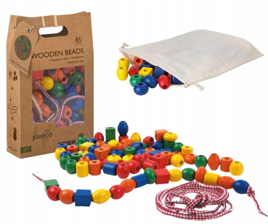 Zestaw drewnianych korali Joueco to idealna zabawka edukacyjna dla dzieci od 3 roku życia. Kolorowe elementy w różnych kształtach pozwalają tworzyć własne naszyjniki i bransoletki, rozwijając zdolności manualne oraz wyobraźnię. Duże otwory sprawiają, że nawlekanie jest proste i bezpieczne, a igła nie jest potrzebna. Po skończonej zabawie wszystkie elementy można przechować w praktycznej torbie bawełnianej. Wykonane z wysokiej jakości drewna i pokryte nietoksyczną farbą, korale gwarantują bezpieczną i trwałą zabawę.