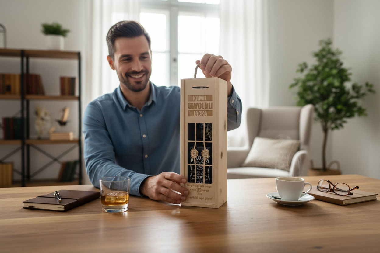 Zaskocz bliską osobę oryginalnym i zabawnym prezentem! Drewniana skrzynka z grawerem to świetny sposób na eleganckie zapakowanie butelki wina, whisky, piwa lub innego trunku.
