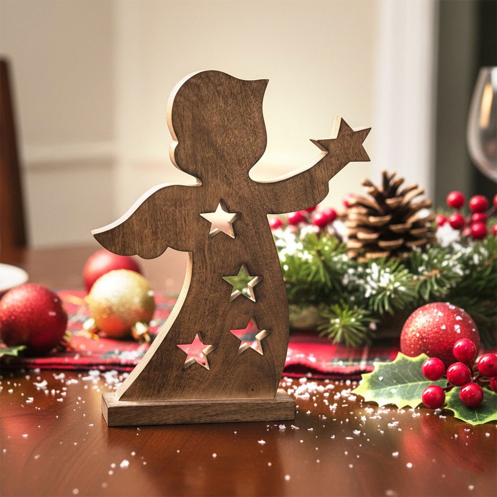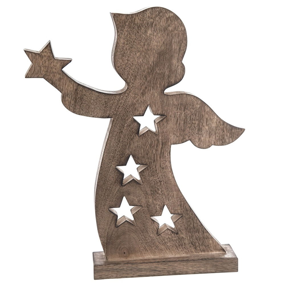Figurka anioła wykonana z naturalnego drewna mangowca. Prezentuje się bardzo efektownie. Figurka będzie wyjątkową dekoracją oraz pomysłem na oryginalny upominek. Idealna na okres zimowo, świąteczny, ale możemy użytkować ją również cały rok.