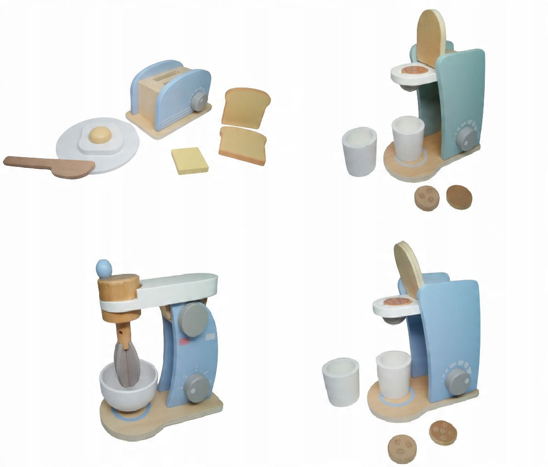 Drewniane zabawki - urządzenia kuchenne: toster, ekspres do kawy i mikser z akcesoriami (m.in. tosty, jako, nożyk, filiżanka).
