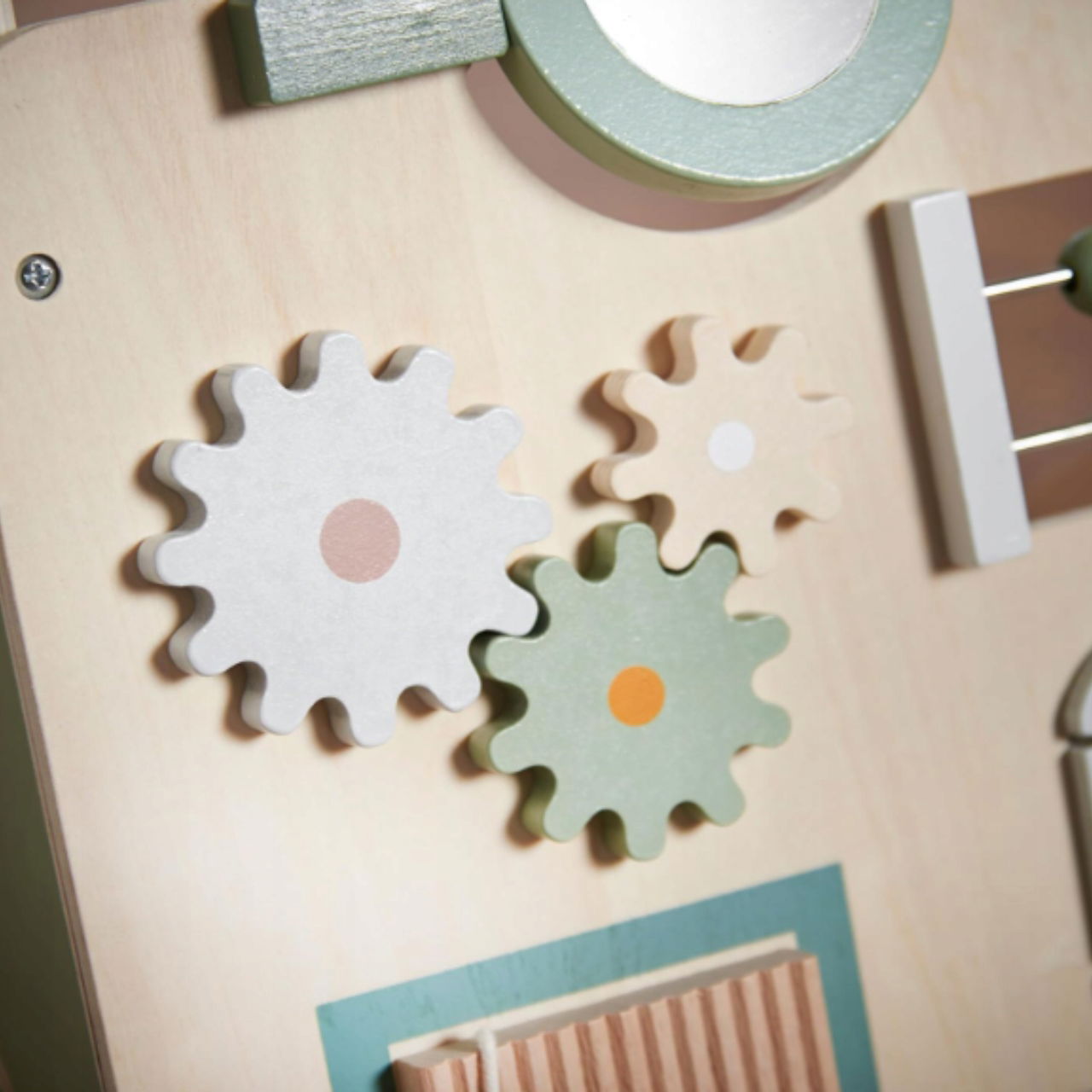✅ Centrum aktywności 5 w 1 – obracane klocki, liczydło, lusterko, labirynt i kolorowe elementy sensoryczne.