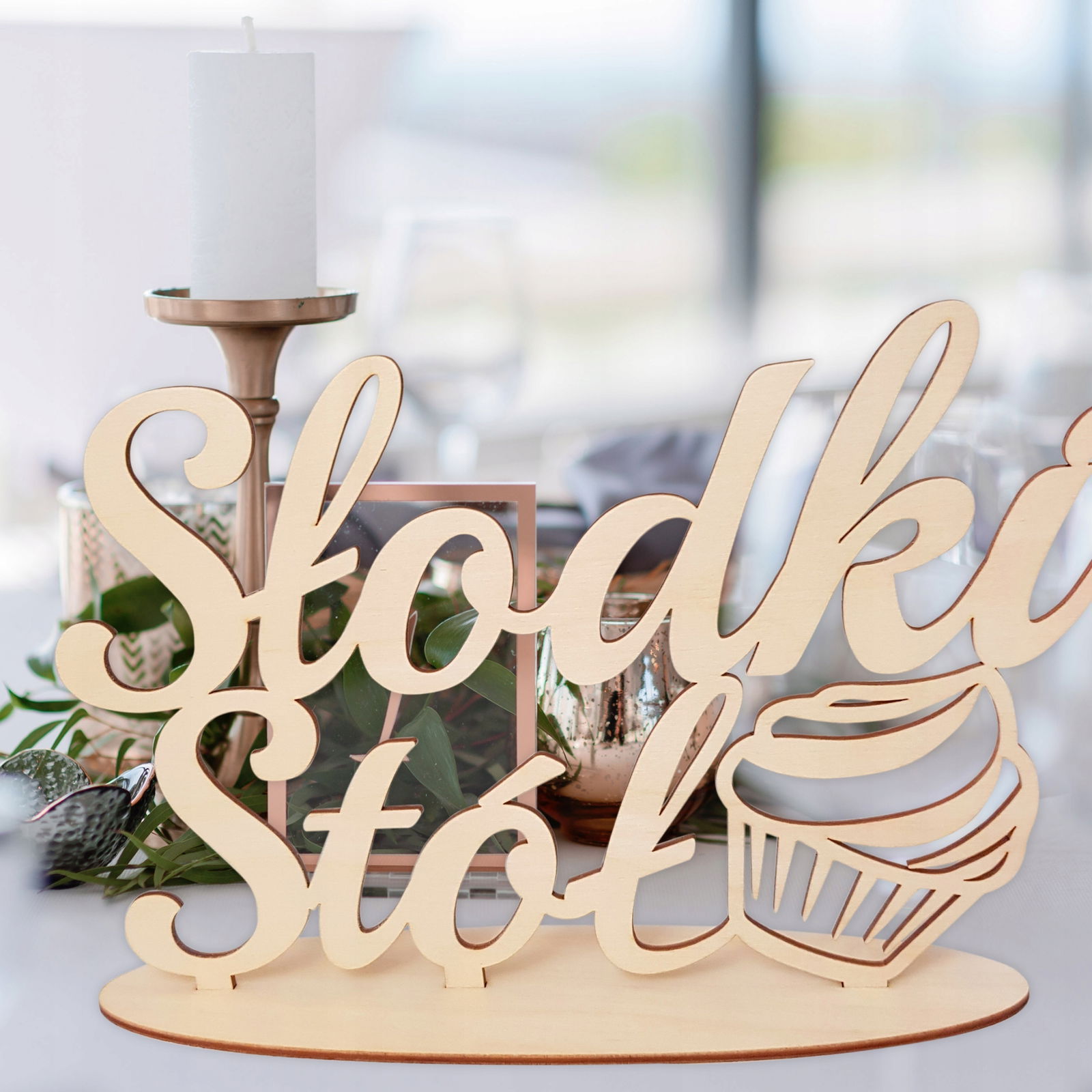 • Drewniany napis z podstawką na wesele ślub wykonany ze sklejki brzozowej. Taka dekoracja dopełni wystrój sali ślubnej.