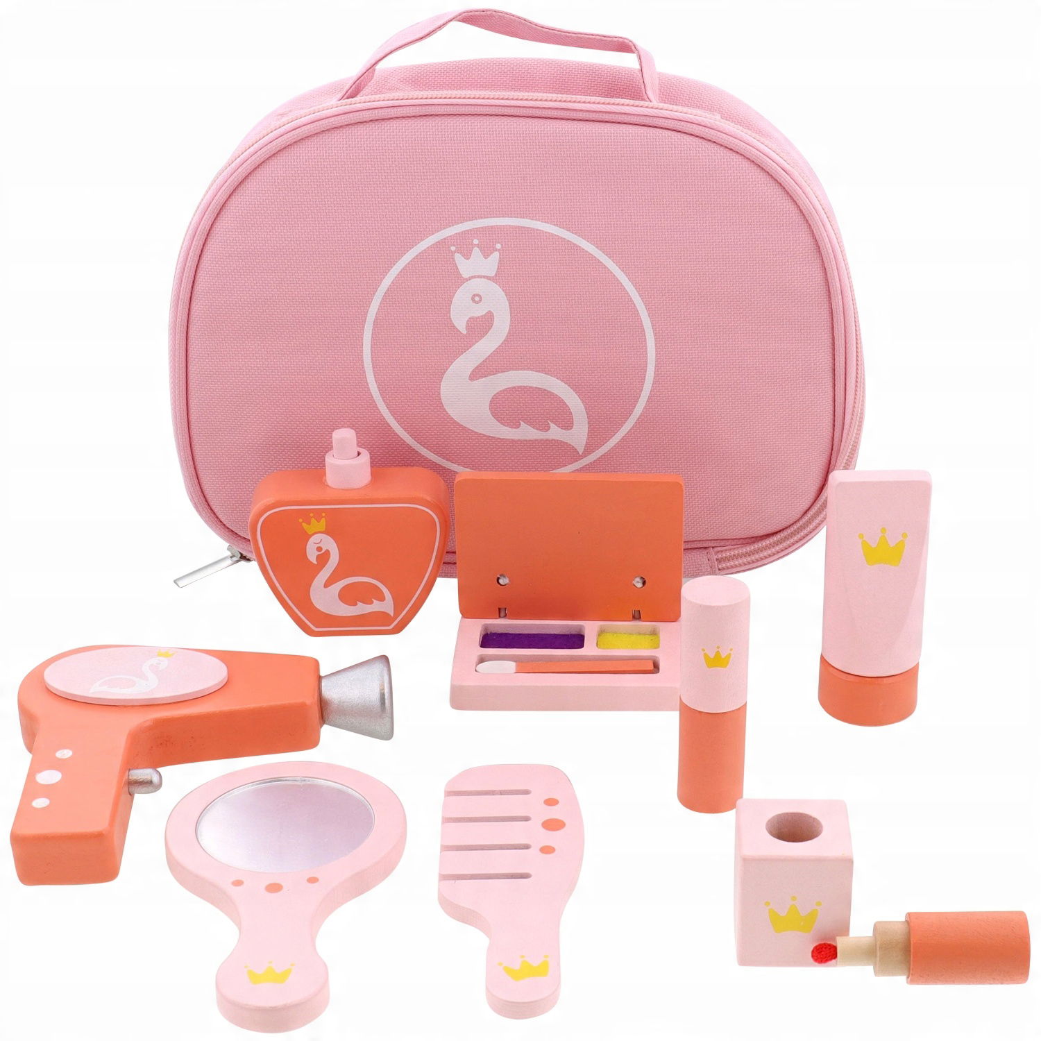- Elementy zestawu: Drewniana paleta cieni|Drewniana suszarka|Drewniana szminka|Drewniane lusterko|Drewniane perfumy|Drewniany grzebyk|Drewniany krem|Drewniany lakier paznokci|Różowa kosmetyczka zamek