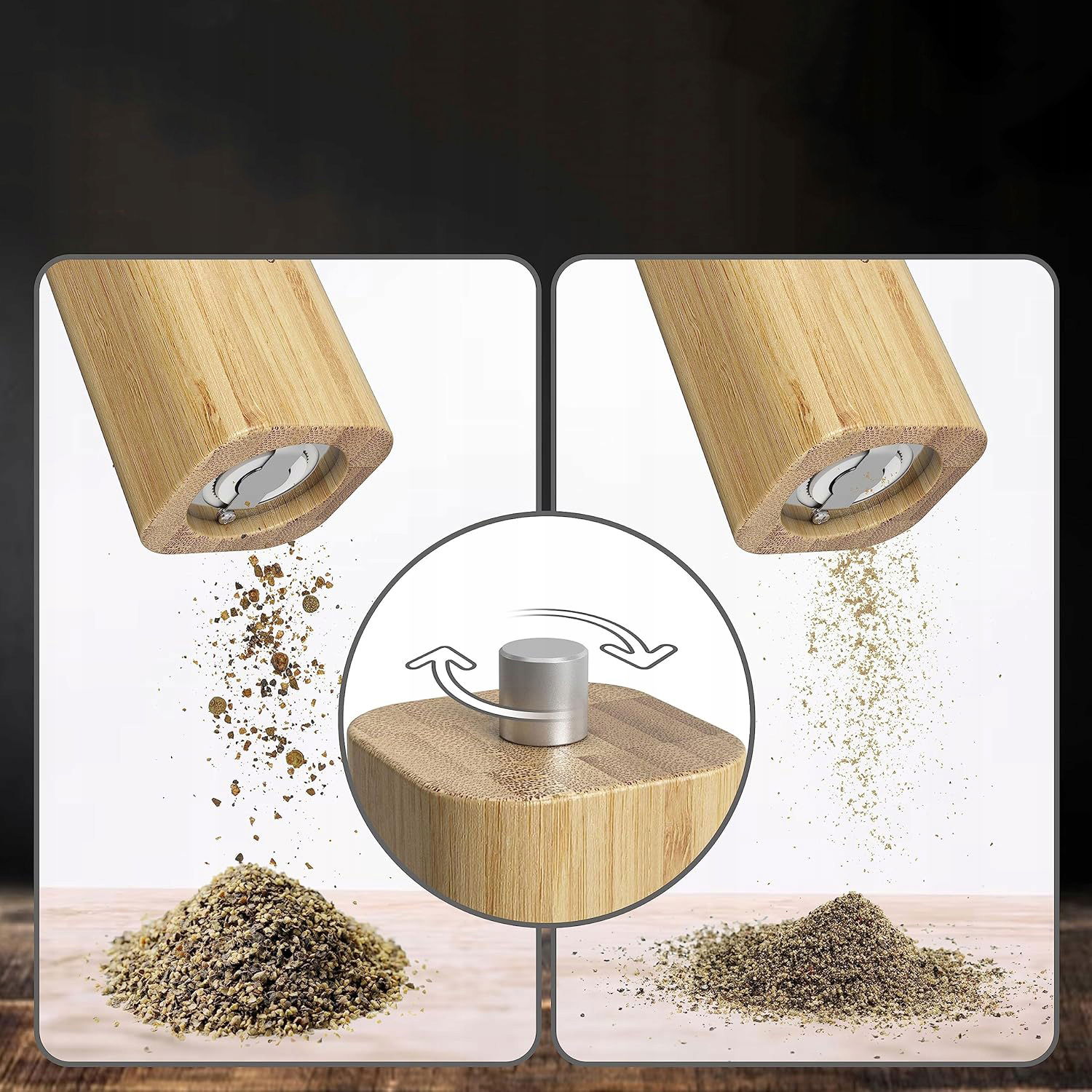 Młynki wykonano z trwałego bambusa i ceramiki, co gwarantuje długowieczność produktu. Naturalny kolor bambusa dodaje elegancji, a precyzyjny ceramiczny mechanizm zapewnia równomierne mielenie przypraw bez bałaganu.