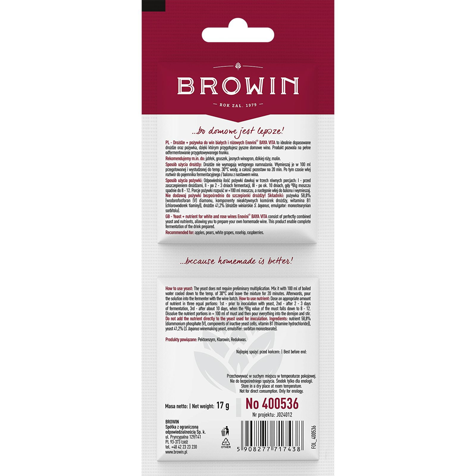 Drożdże + pożywka do win białych i różowych Enovini® BAYA VITA to idealnie dopasowane drożdże Saccharomyces Bayanus oraz pożywka, dzięki którym przygotujesz swoje domowe wino. Produkt pozwala na pełne odfermentowanie przygotowywanego trunku. Istotne cechy: • Gramatura 7 g drożdży + 10 g pożywki • Na 10-25 L nastawu • Idealne do win m.in. z jabłek, gruszek, jasnych winogron, dzikiej róży, malin Sposób użycia: Drożdże nie wymagają wstępnego namnażania. Wymieszaj je w 100 ml przegotowanej i wystudzonej do temp. 30 °C wody, a następnie całość pozostaw na 20 min. Po tym czasie wlej roztwór do pojemnika fermentacyjnego/balonu z nastawem wina. Odpowiednią ilość pożywki (1 g pożywki/1,5-2,5 L moszczu) dawkuj w trzech równych porcjach: I - przed zaszczepieniem drożdżami, II - po 2-3 dniach fermentacji, III - po ok. 10 dniach, gdy ° Blg moszczu spadnie do 8-12. Porcje pożywki rozpuść w 100 ml moszczu, a następie wlej do pojemnika/balonu i wymieszaj. Nie dodawaj pożywki bezpośrednio do szczepionki drożdży! Składniki: pożywka 58,8% (wodorofosforan (V) diamonu, komponenty nieaktywnych komórek drożdży, witamina B1 (chlorowodorek tiaminy)), drożdże 41,2% (drożdże winiarskie S. bayanus, emulgator: monostearynian sorbitolu). Masa netto: 17 g