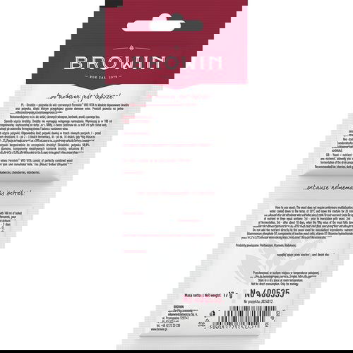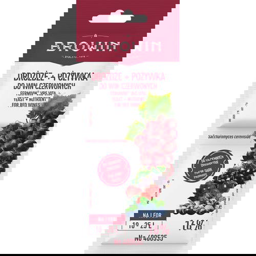 Drożdże + pożywka do win czerwonych Fermivin® VR5 VITA to idealnie dopasowane drożdże oraz pożywka, dzięki którym przygotujesz swoje domowe wino. Produkt pozwala na pełne odfermentowanie przygotowywanego trunku. Istotne cechy: • Gramatura 7 g drożdży + 10 g pożywki • Na 10-25 L nastawu • Idealne do win m.in. z wiśni, ciemnych winogron, borówek, aronii, czarnego bzu. Sposób użycia: Drożdże nie wymagają wstępnego namnażania. Wymieszaj je w 100 ml przegotowanej i wystudzonej do temp. 30 °C wody, a następnie całość pozostaw na 20 min. Po tym czasie wlej roztwór do pojemnika fermentacyjnego/balonu z nastawem wina. Odpowiednią ilość pożywki (1 g pożywki/1,5-2,5 L moszczu) dawkuj w trzech równych porcjach: I - przed zaszczepieniem drożdżami, II - po 2-3 dniach fermentacji, III - po ok. 10 dniach, gdy ° Blg moszczu spadnie do 8-12. Porcje pożywki rozpuść w 100 ml moszczu, a następie wlej do pojemnika/balonu i wymieszaj. Nie dodawaj pożywki bezpośrednio do szczepionki drożdży! Składniki: pożywka 58,8% (wodorofosforan (V) diamonu, komponenty nieaktywnych komórek drożdży, witamina B1 (chlorowodorek tiaminy)), drożdże 41,2% (drożdże winiarskie S. cerevisiae, emulgator: monostearynian sorbitolu). Masa netto: 17 g
