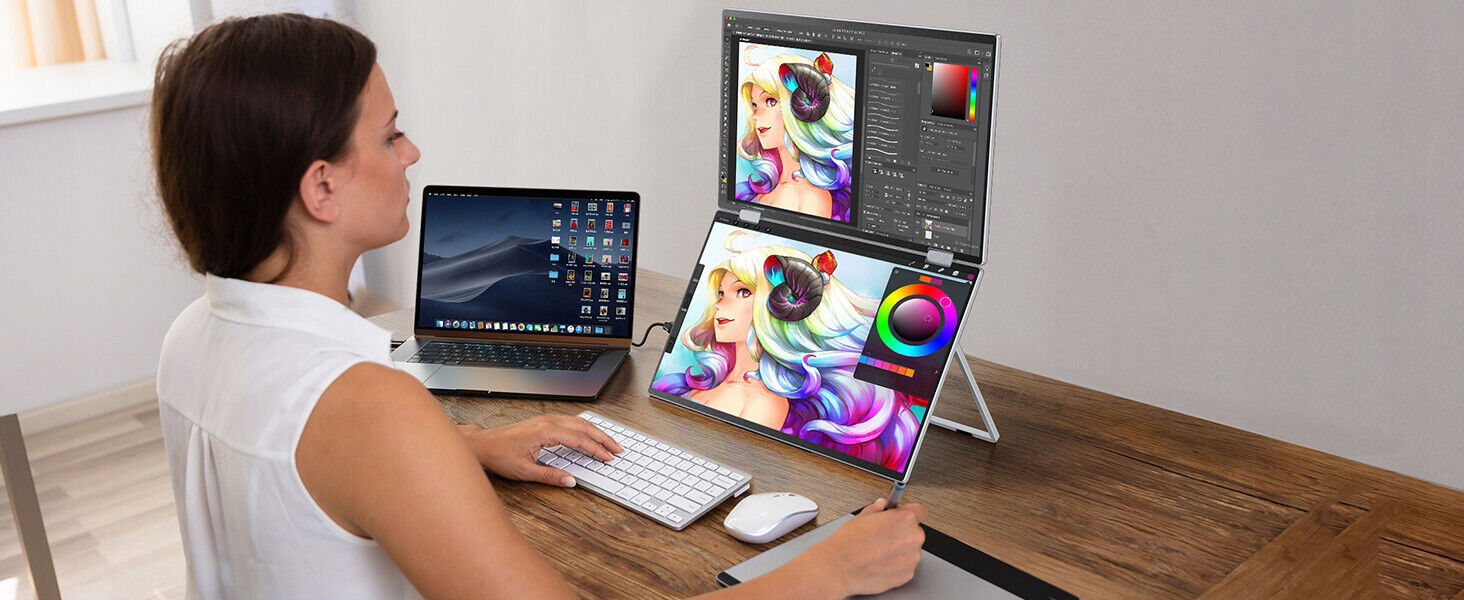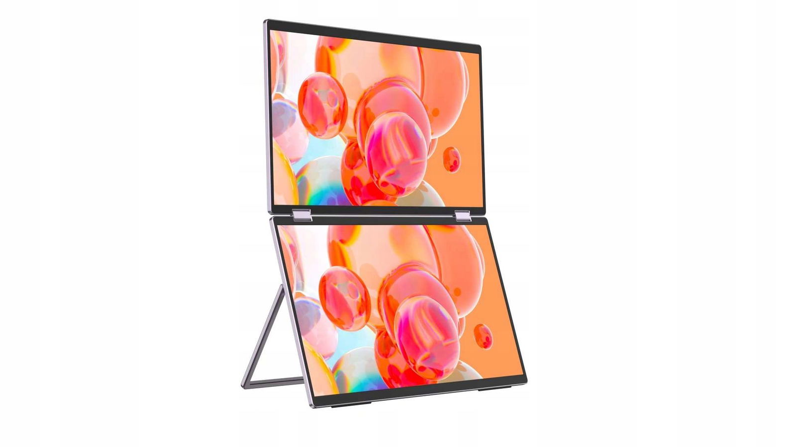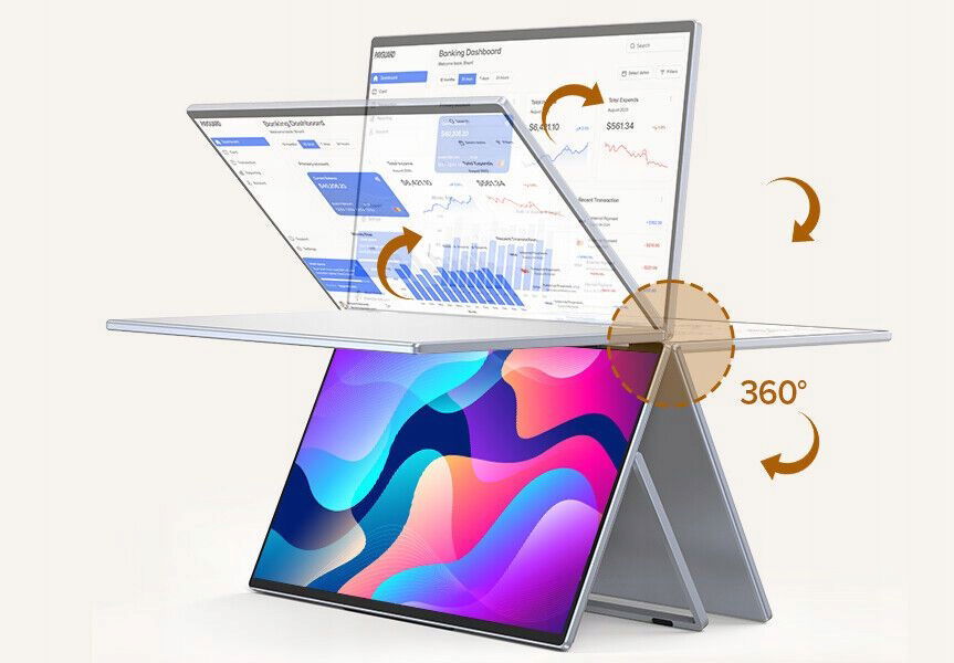 Składany monitor można złożyć o 360° i ustawić pod różnymi kątami, aby dostosować się do potrzeb różnych kątów ekranu. Jednocześnie składana konstrukcja umożliwia łatwe złożenie, dzięki czemu podwójny ekran można łatwo umieścić w plecaku i zwiększyć przenośność. Do monitora dołączona jest składana konstrukcja podstawy, która ułatwia korzystanie z monitorów w wielu konfiguracjach.