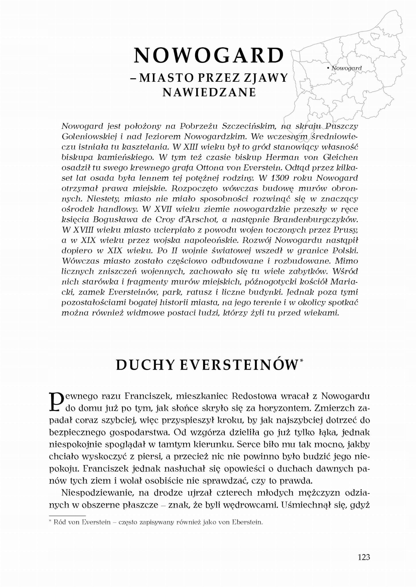 Województwo zachodniopomorskie jest województwem niezwykłym. Burzliwa historia tych terenów sprawiła, że każdy jego zakątek kryje w sobie niejedną tajemnicę. To nie tylko atrakcyjne miejsce wypoczynku, lecz również niewyczerpane źródło inspiracji dla poszukiwaczy ciekawych opowieści. Zjawy błąkające się wśród wąskich uliczek lub czyhające na drogach, zaklęte księżniczki strzegące skarbów, czy ukryte wśród ruin skarby sprawiają, że każde miejsce nabiera innego wymiaru: intryguje, motywuje do samodzielnych poszukiwań oraz do zgłębiania ich niezwykłych dziejów. Czytelnicy znajdą w tej książce niejedną opowieść, która zachęci do sprawdzenia, czy w legendach tkwi przysłowiowe ziarno prawdy.
