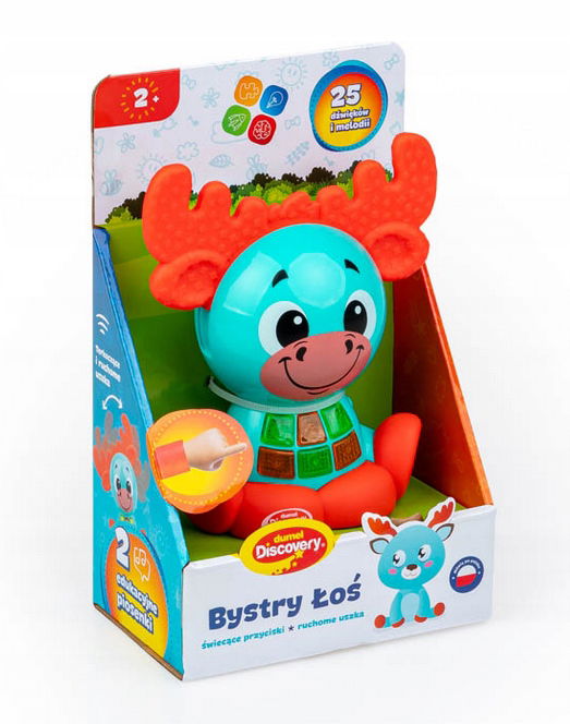 Jego brzuszek zdobią przyciski, aktywujące poszczególne dźwięki oraz światełka. Łosiowe poroże także wydaje dźwięk, a jest nim terkotanie, które maluch usłyszy za każdym razem, gdy przekręci poroże w prawą lub w lewą stronę.