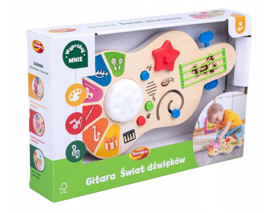 Z drewnianą gitarą wyczarujesz koncert na pianino, bębenek, flet, saksofon, trąbkę, marakasy oraz skrzypce! Baw się na 3 różne sposoby, odkrywając dźwięki instrumentów muzycznych, kolory światełek i znane melodie. W gitarze kryją się też dodatkowe niespodzianki, w postaci terkoczącej gwiazdki i dotykowych strun, na których możesz grać zupełnie tak, jak na prawdziwych. Zostań wirtuozem dźwięku i przekonaj się jak wspaniałą zabawą jest tworzenie muzyki!