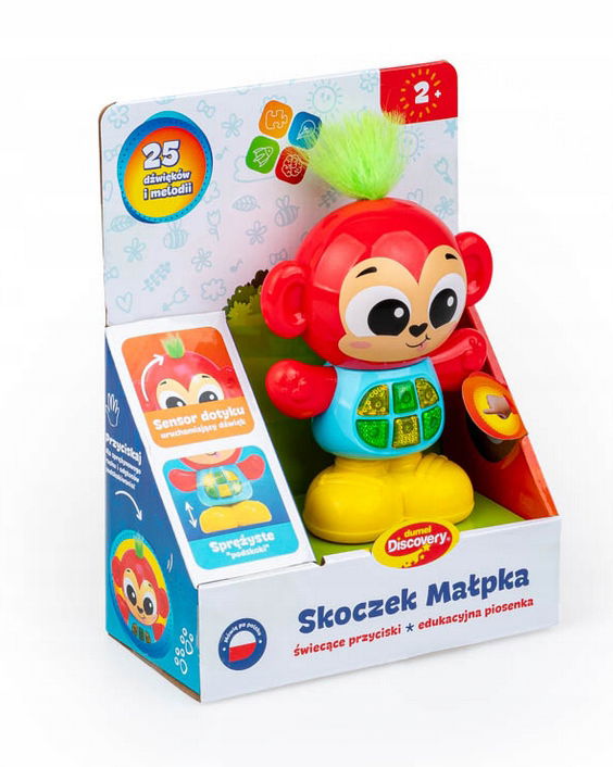 Gotowi na małpie „podskoki”? Ten uroczy zwierzak posiada sprężyste nóżki, dzięki czemu można go przycisnąć, słuchając przy tym zabawnych odgłosów sprężynowych skoków! Zabawka mówi po polsku i zna aż 25 różnych dźwięków oraz melodii, w tym także edukacyjną piosenkę.